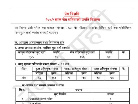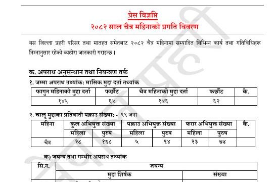 चैत्र महिनाभरीको भक्तपुर प्रहरीको कार्यसम्पादन विवरण सार्वजनिकभक्तपुर, बैशाख २ गतेजिल्ला प्रहरी कार्यालय भक्तपुरले चैत्र महिनाभरी गरेका कार्य सम्पादनहरुको विवरण आज सार्वजनिक गरेको छ । जिल्लाको…