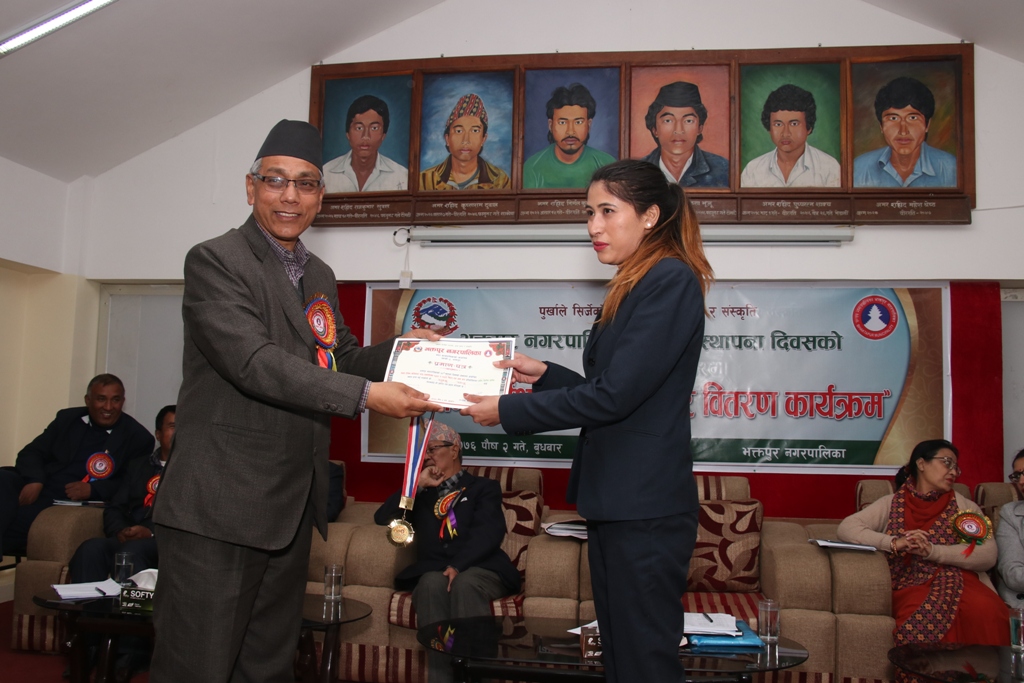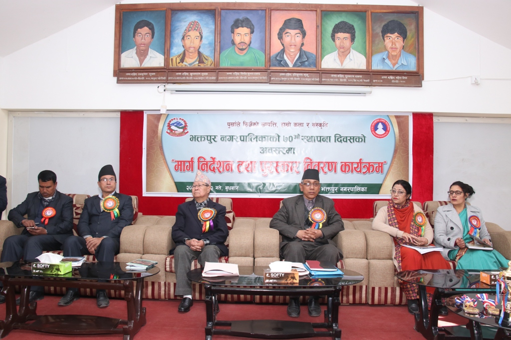 भक्तपुर नगरपालिका स्थापना भएको पुस २ गते ७० औं वर्षमा प्रवेश ग¥यो । भक्तपुर नगरपालिकाको ७० औं स्थापना दिवसको उपलक्ष्यमा जनप्रतिनिधि र कर्मचारीबीच मार्गनिर्देशन कार्यक्रम तथा स्थापना दिवसको अवसरमा आयोजित विविध खेलकुद प्रतियोगिताको पुरस्कार वितरण कार्यक्रम बुधबार नगरपालिकाको सभाकक्षमा सम्पन्न भयो ।