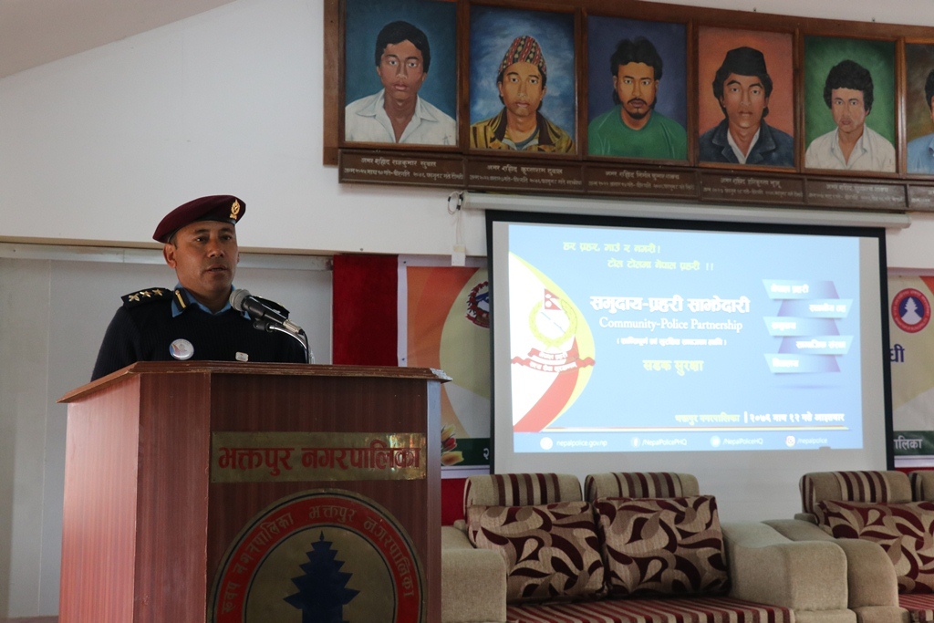 उहाँले विभिन्न अपराधिक गतिविधि सँगसँगै लागु औषधको दुव्र्यसनी बढ्दै जानु चिन्ताजनक भएको बताउनुहुँदै समाजमा रहेका समुदायका नगारिकहरु सचेत भई स्थानीय प्रशासन तथा नगरपालिकाको समन्वय, सहकार्य र सहयोगबाट भक्तपुर नगरलाई सुरक्षित नगर बनाउन सहयोग गर्नुपर्ने बताउनुभयो ।