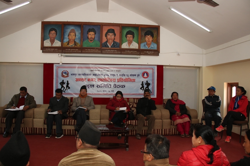 उपमेयर रजनी जोशीले साँस्कृतिक नगरी भक्तपुरमा जनताको स्वस्थ जीवन शैलीका लागि विभिन्न गतिविधिहरु गर्दै आउनेक्रममा खेलकूदका प्रतियोगिताहरु पनि आयोजना गर्दै आएको भन्दै अन्तर नगर एथलेटिक्स खेलकूद प्रतियोगितालाई उदाहरणीय रुपमा भव्य सफल हुने गरी प्रतियोगिता आयोजना गर्ने तयारी भइरहेको बताउनु भयो । वडा नम्वर ७ का वडाध्यक्ष उकेश कवांले भक्तपुर नगरमा पर्याप्त खेलमैदान नभएकाले पैसा भएर पनि भौतिक पूर्वाधार बनाउन नसकि रहेको उल्लेख गर्दै अभाबै अभावको बीचमा पनि भक्तपुरका मेहनती खेलाडीहरुको कडा मेहनतले राष्ट्यि अन्तर्राष्ट्यि छवि बनाउन सफल भएको बताउनु भयो भने वडा नम्वर २ का वडाध्यक्ष हरिप्रसाद बासुकलाले नगरवासीलाई स्वस्थ, अनुसाशित र मेहनती बनाउन खेलकूदका गतिविधी आयोजना गर्दै आएको बताउनु हुँदै मूल समारोहको बैठक सञ्चालन गर्नु भएको थियो भने बैठकमा एथलेटिक्सका राष्ट्यि खेलाडी कान्छिमैया कोजू, अन्तर्राष्ट्यि रेफ्रि विनोद राय, गौतमप्रसाद लासिवा, मुना बासुकला र साथ नगर खेलकुद समितिका अध्यक्ष श्याम खत्री, कुमार चवाल लगायत जनप्रतिनिधी तथा विभिन्न संचार माध्यमका पत्रकारहरुको सहभागिता थियो |