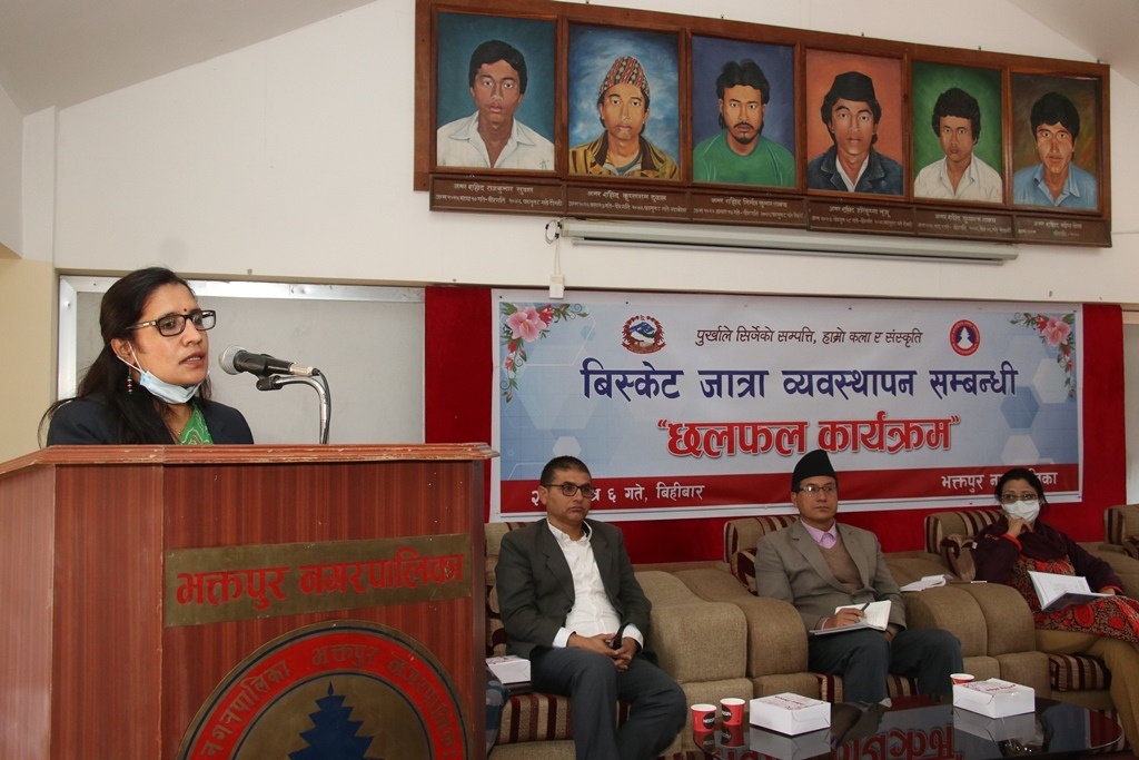 भक्तपुरको प्रसिद्ध बिस्केट जात्रा व्यवस्थित र शान्तिपूर्ण तरिकाले सम्पन्न गर्न भक्तपुर नपाले बिस्केट जात्रा व्यवस्थापनसम्बन्धी बिहीबार सरोकारवालाहरुसँग छलफल कार्यक्रमको आयोजना ग¥यो ।