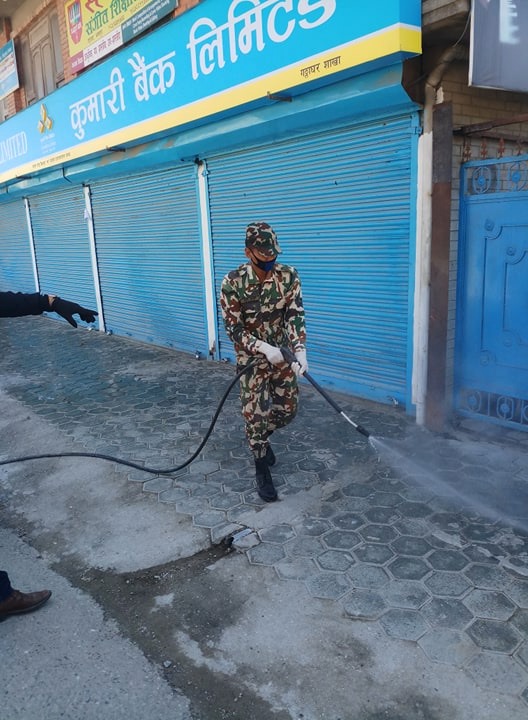 भक्तपुर । कोरोना भाइरस (कोभिड १९) संक्रमणबाट बचाउन नेपाली सेना भैरब बाहण गुल्म गठाघर भक्तपुरले कोरोनाविरुद्ध किटनाषक औषधि (डिस्इनफाक्टान्ट) छर्न सुरु गरेको छ । मध्यपुर थिमि नगरपालिकासँंगको समन्वयमा नगरपालिका क्षेत्रभरि औषधि छर्ने काम सुरु गरिएको जनाइएको छ ।
