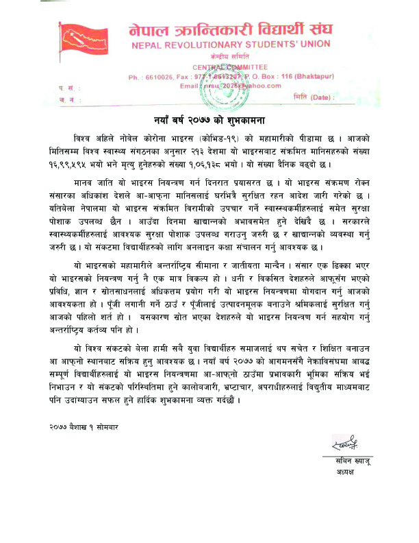 यो विश्व संकटको बेला हामी सबै युवा विद्यार्थीहरु समाजलाई थप सचेत र शिक्षित बनाउन आ आप्mनो स्थानबाट सक्रिय हुनु आवश्यक छ । नयाँ बर्ष २०७७ को आगमनसँगै नेक्राविसंघमा आबद्ध सम्पूर्ण विद्यार्थीहरुलाई यो भाइरस नियन्त्रणमा आ–आफ्नो ठाउँमा प्रभावकारी भूमिका सक्रिय भई निभाउन र यो संकटको परिस्थितिमा हुने कालोबजारी, भ्रष्टाचार, अपराधीहरुलाई विद्युतीय माध्यमबाट पनि उदांग्याउन सफल हुने हार्दिक शुभकामना व्यक्त गर्दछौं ।