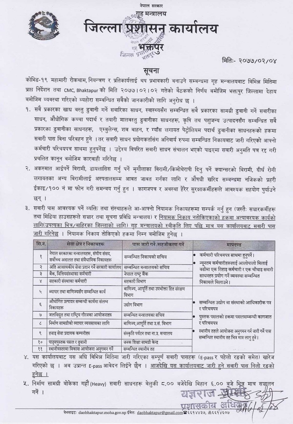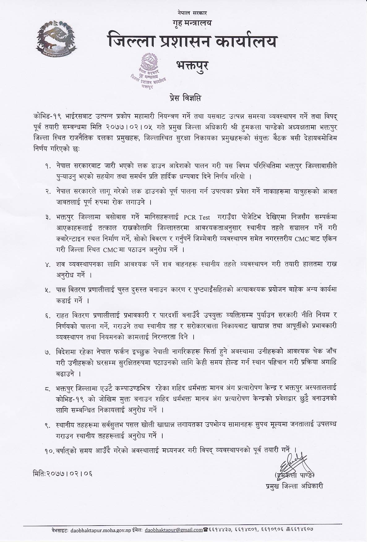 जिल्लाको सिमानाकामा कडाई गरी कृषि उत्पादन र बजार ब्यवस्थापन एवं नियमनलाई ध्यान दिन्दै जोखिम व्यवस्थापनका लागि लक डाउन प्रभावकारी बनाउने पक्षमा भक्तपुरका राजनैतिक दल, सुरक्षा निकायको संयुक्त बैठकबाट जिल्ला प्रशासन कार्यालय भक्तपुरले विभिन्न निणर्य गरेको उहाँले बताउनु भयो । जेष्ठ ५ गतेको सो बैठकले कोरना भाइरसको परीक्षण बढाउने, लकडाउनको पूर्ण परिपालनकोलागि उपत्यका प्रवेश नाकाहरुमा यात्रुहरुको आवजावतलाई पूर्ण रुपमा रोक लगाउने, भक्तपुर जिल्लामा बसोबास गर्ने मानिसहरुलाई पिसिआर परीक्षण पोजेटिभ देखिएमा निजसँग सम्पर्कमा आएकाहरुलाई तत्काल राख्नको लागि जिल्लास्तरमा आवश्यता अनुसार स्थानीय तहले सञ्चालन गर्ने गरी क्वारेन्टाइन स्थल निर्माण गर्ने, सोको विवरण र गर्नुपर्ने जिम्मेवारी व्यवस्थापन समेत नगरस्तरीय सिएमसीबाट एकिन गरी जिल्ला स्थित सिएमसीमा पठाउन अनुरोध गर्ने, शब व्यवस्थापनका लागि स्थानिय तहले सव बाहानको तयारी गर्ने, पास वितरणलाई चुस्त दुरुस्त गरी अतिआवश्यक बाहेक अन्य कार्यमा कडाइ गर्ने, राहात वितरणलाई प्रभावकारी र पारदर्शी बनाई सरकारी नियम र निणर्यलाई पालना गर्ने, गराउने र स्थानीय तह र सरोकारबाला निकायहरुबाट खाद्यान्न तथा आपूर्ति प्रभावकारी व्यवस्थापन र नियमनको कामलाई निरन्तरता दिने, विदेशबाट फर्कन इच्छुक नेपालीहरुको चेक जाँच गरी सुरक्षित रुपमा घरसम्म पुर्याउने, शदीद धर्मभक्त अंक प्रत्यारोपन केन्द्रको सेवालाई ध्यान दिइ छुटै मार्गको व्यवस्था एवं भक्तपुर अस्पताल परिसरलाई कोभिड मुक्तक्षेत्र बनाउने, स्थानीय तहहरुमा सर्वसुलभ पसल खोली खाद्यान्न लगायतका उपभोगिय सामानहरु सुपथ मुल्यमा जनतालई उपलब्ध गराउने र वर्षात्को समयमा हुन सक्ने बाढी पहिरो लगायतको विपद् व्यवस्थापनको पूर्व तयारी गर्ने विषयमा छलफल भएको जनाएको छ ।