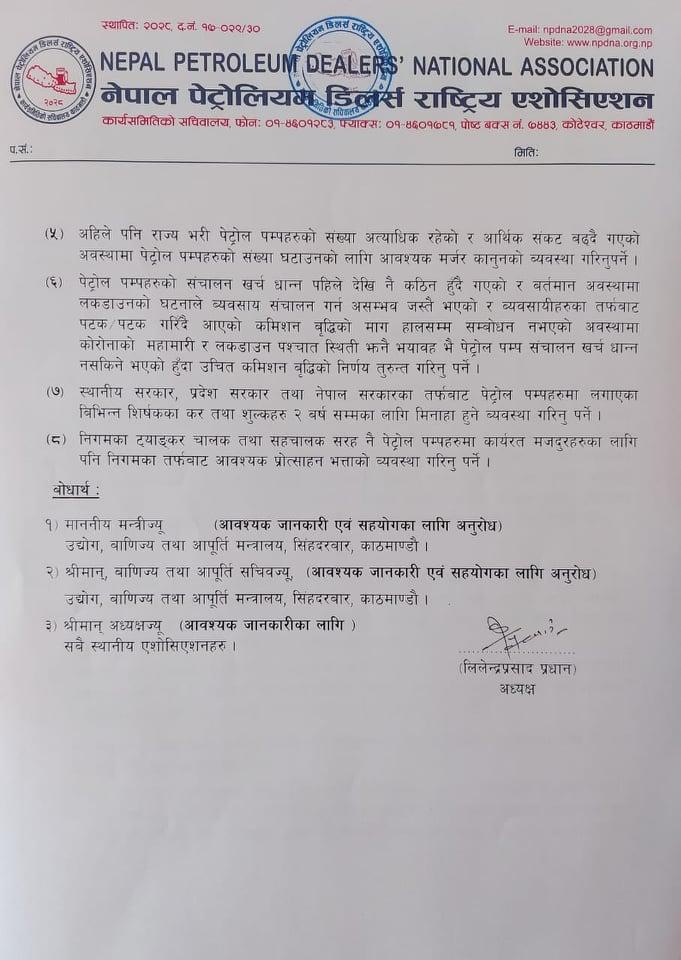 व्यापार नभए पनि अतिआवश्यक पदार्थ भएकोले चलाउनुपरेको र त्यस क्रममा विभिन्न व्यक्तिहरुसँग प्रत्यक्ष सम्पर्कमा जानुपर्ने भएकोले पीसीआर प्रविधिबाट श्वाव परीक्षणको व्यवस्था मिलाउन नेपाल आयल निगम लिमिटेडसँंग एसोसिएसनले माग राखेको हो । सोमबार नेपाल आयल निगम लिमिटेडका कार्यकारी निर्देशकसक्षम आठ वटा मागसहितको मागपत्र प्रस्तुत गर्दै एसोसिएसनले लकडाउनको अवस्थामा पम्पमा वस्ने मजदुर कर्मचारीहरुलाई तलव नै भुक्तानी गर्न नसकेको कारण यो अवधिसम्मको तलब नियमगकोतर्फबाट वन्दोवस्त मिलाइदिन पनि माग राखेको छ ।