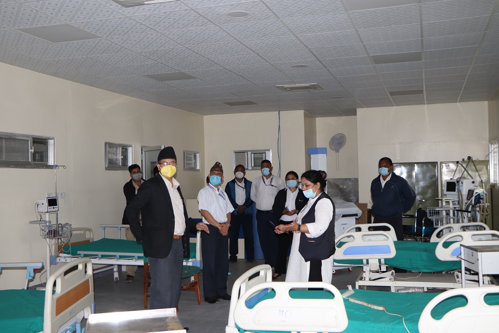 निरीक्षणका क्रममा उहाँले भक्तपुर नपा वडा नं. १ स्थित भक्तपुर अस्पतालको प्रांगणमा कोभिड–१९ को लागि बनाइएको आइसोलेसन वार्ड र आईसीयु कक्षको पनि अवलोकन गर्नुभयो । सो अवसरमा भक्तपुर अस्पतालका मेडिकल सुपरिटेन्डेन्ट सुमित्रा गौतमले छिनै नै आइसियु कक्ष सञ्चालनमा ल्याउने जानकारी दिनुभयो ।