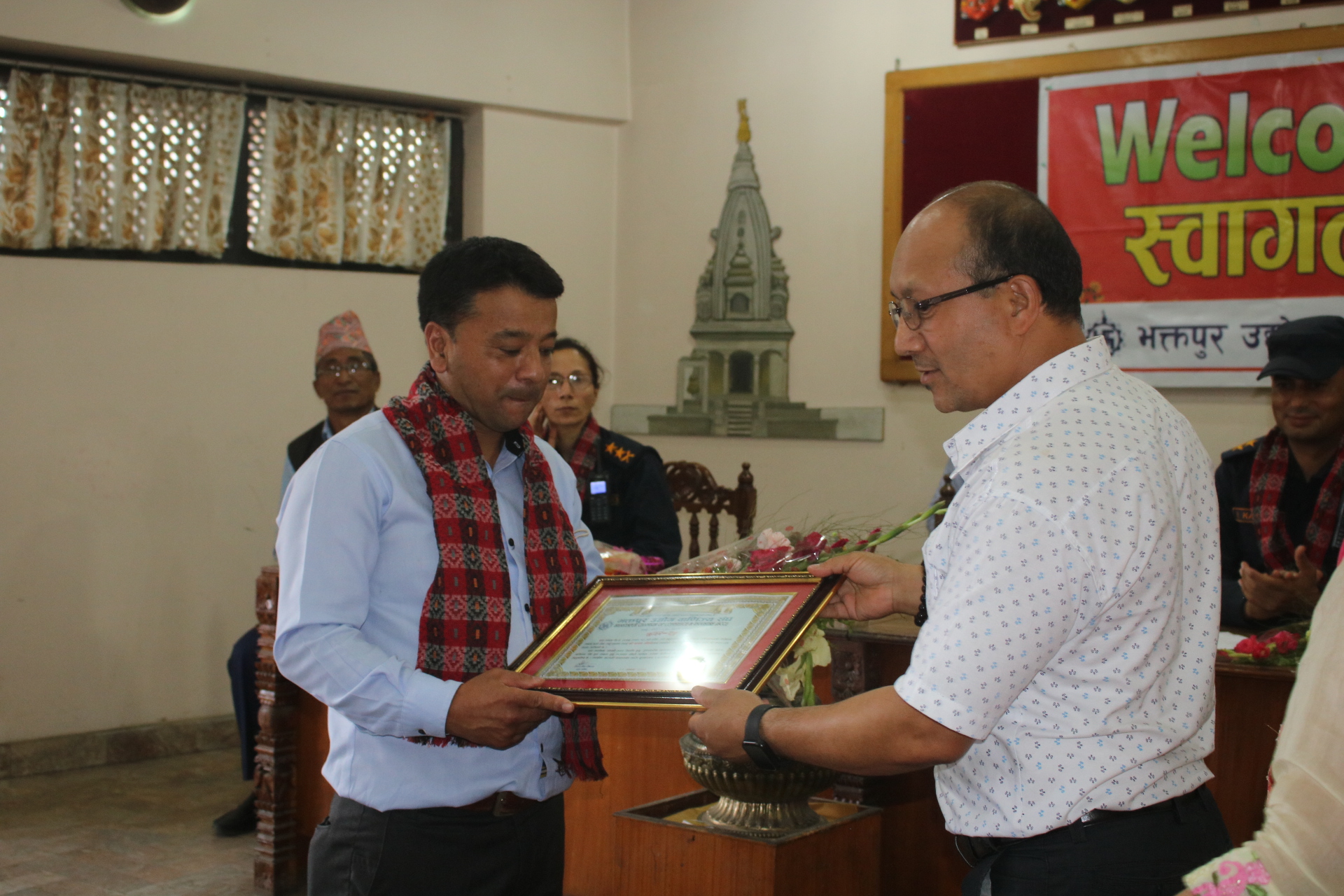 संघका अध्यक्ष श्रेष्ठले नवनियुक्त प्रहरी उपरिक्षक थापा र प्रहरी नायव उपरिक्षक कडेललाई स्वागत गर्दै आफ्ना ३० वर्ष कार्यकाल पूरा गरेका जोन्छेलाई कदर पत्र सहित विदाई गर्नु भयो ।