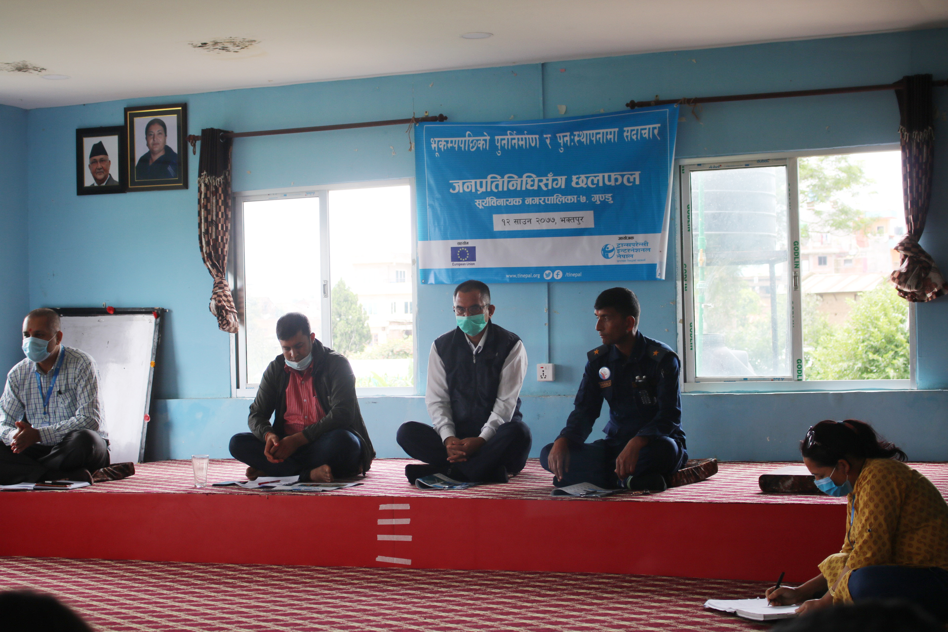 कोरना भाइरसको जोखिमले पुनर्निर्माण कार्य प्रभावित भए पनि कोरनाको विपद् रोकथाम र व्यवस्थापनमा स्थानीय समुदाय सचेत रहेको स्थानीयको भनाई छ । कोरना भाइरस संक्रमणको जोखिमका कारणले भने पुनर्निर्माण कार्य प्रभावित रहेको पनि स्थानीयले जनाएका छन् ।छलफलमा टीआई नेपाल भक्तपुर जिल्ला अधिकृत जुनु ढकालले सहजिकरण गर्नु भएको थियो ।