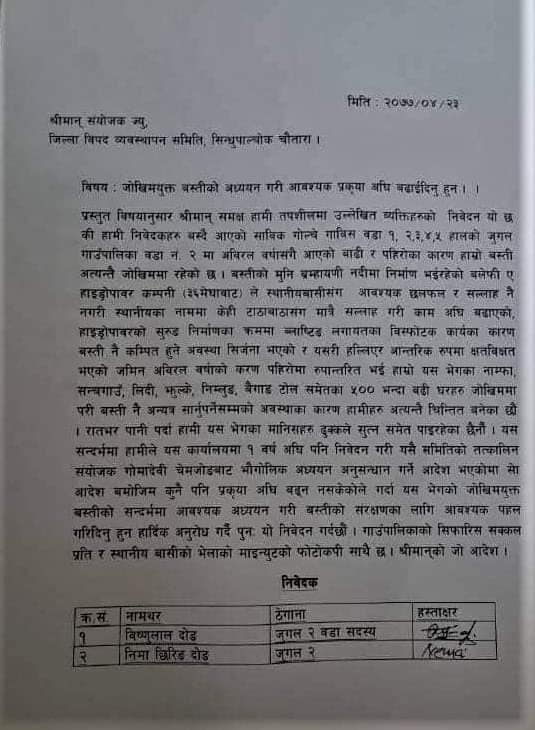लिदी गाउँका ठाउँ ठाउँमा धाँजा फातेको, माटो बगाएकाले आफूहरु असुक्षित भएको भनि सिन्धुपालोक जिल्लाको जुगल गाउँपालिका २ स्थिति लिदीका स्थानीय जनताले जिल्ला प्रशासन कार्यालय सिन्धुपाल्चोकमा ज्ञापन पत्र दिइ पटक पटक ध्यानाकर्षण गराएका थिए तर त्यसको कुनै पनि सुनुवाई नहुँदा सो गाउँ पहिरोले सखाप भएको स्थानीय सञ्चारकर्मी रत्न श्रेष्ठले जनाएको छ । स्थानीय जनताको आवाजलाई रेडियो सिन्धु मार्फत प्रशारण गरी जिल्लाका प्रमुख जिल्ला अधिकारी उमेशकुमार ढकाल समक्ष पटक पटक प्रत्यक्ष साक्षात्कार गउँदा पनि सो क्षेत्रको जोखिमलाई प्रशासनले ध्यान नदिएका कारण शुक्रबारको पहिरोले सो गाउँ सखाप भएको उहाँले बताए । स्थानीय समुदायले दुई दिन अगाडीसम्म पनि सो क्षेत्रमा पहिरोको जोखिम भएको भन्दै प्रजिअ ढकाल समक्ष ज्ञापन पत्र बुझाएका थिए ।