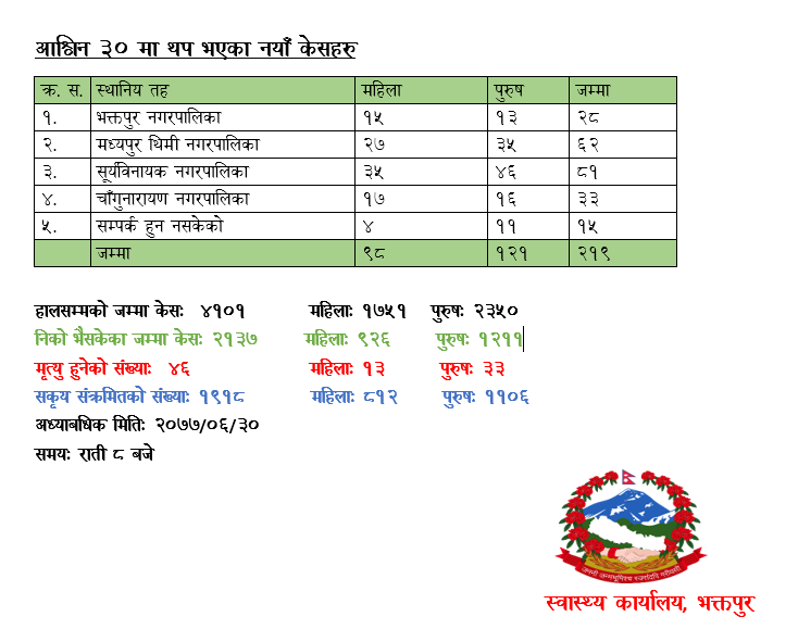 भक्तपुरमा कोरोना संक्रमित ४१०१ पुग्यो, २१३७ जना कोरोना मुक्त, ४६ जनाको मृत्यु