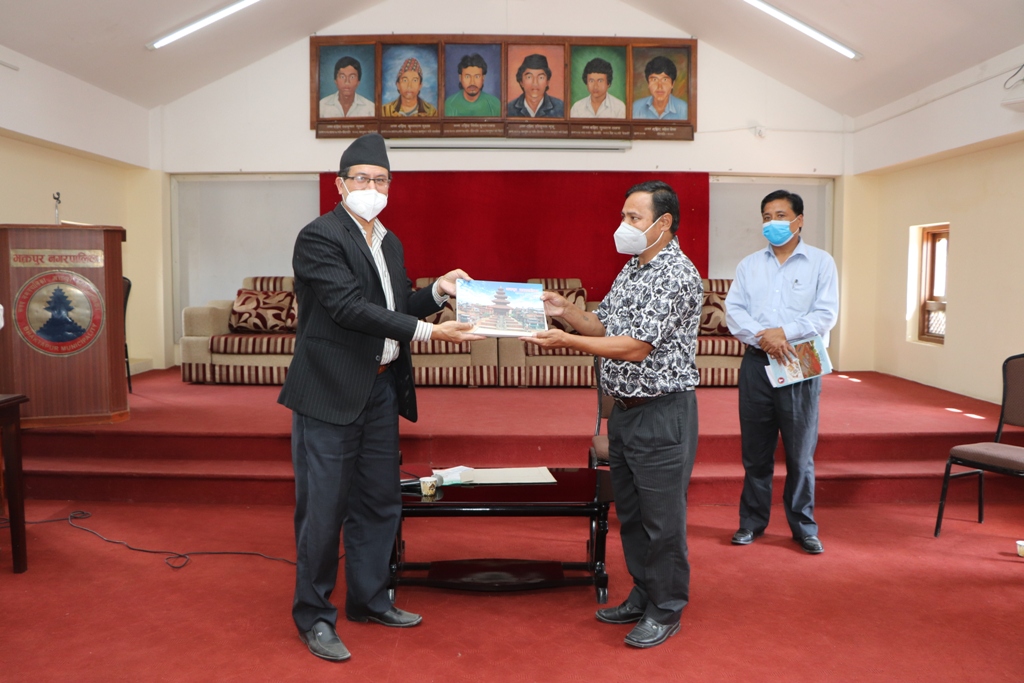 सोही क्रममा नगर प्रमुख प्रजापतिले नगरपालिकाले हालै प्रकाशनमा ल्याएको २०७२ सालको भूकम्पबाट भत्केका र क्षति पुगेका सम्पदाहरूको संक्षिप्त विवरणसहित नगरपालिकाले हालसम्म सम्पन्न गरेका र निर्माणाधीन केही सम्पदाहरूको विवरण समेटिएको ‘सम्पदा पुनःनिर्माण तथा जीर्णोद्धार’ नामक फोटो पुस्तक र नगरपालिकाका केही प्रकाशनहरु अध्यक्ष लाखालाई प्रदान गर्नुभयो ।