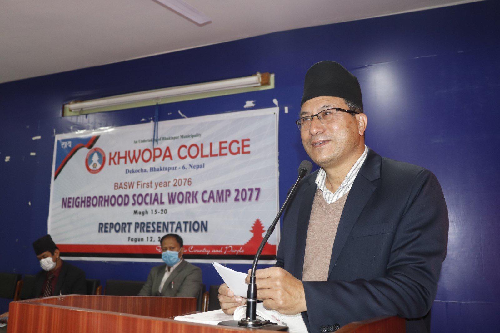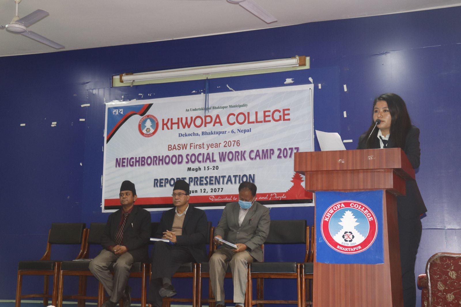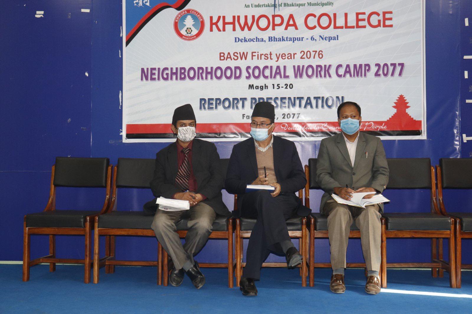 कार्यक्रममा नगर प्रमुख प्रजापतिले ख्वप कलेजमा स्नातक तह बी.ए.एस.डब्लु प्रथम वर्षमा अध्ययनरत विद्यार्थीहरुलाई प्रमाणपत्र वितरण गर्नुभएको थियो । कार्यक्रममा भक्तपुर जिल्लास्थित भक्तपुर नपा, मध्यपुर नपा, सूर्यविनायक नपा र चाँगुनारायण नपाको सामाजिक कार्यबारे गरिएको शिविरको रिपोर्ट प्रस्तुतीकरण देखाएका थिए ।