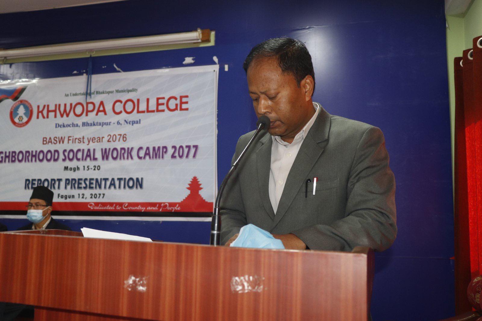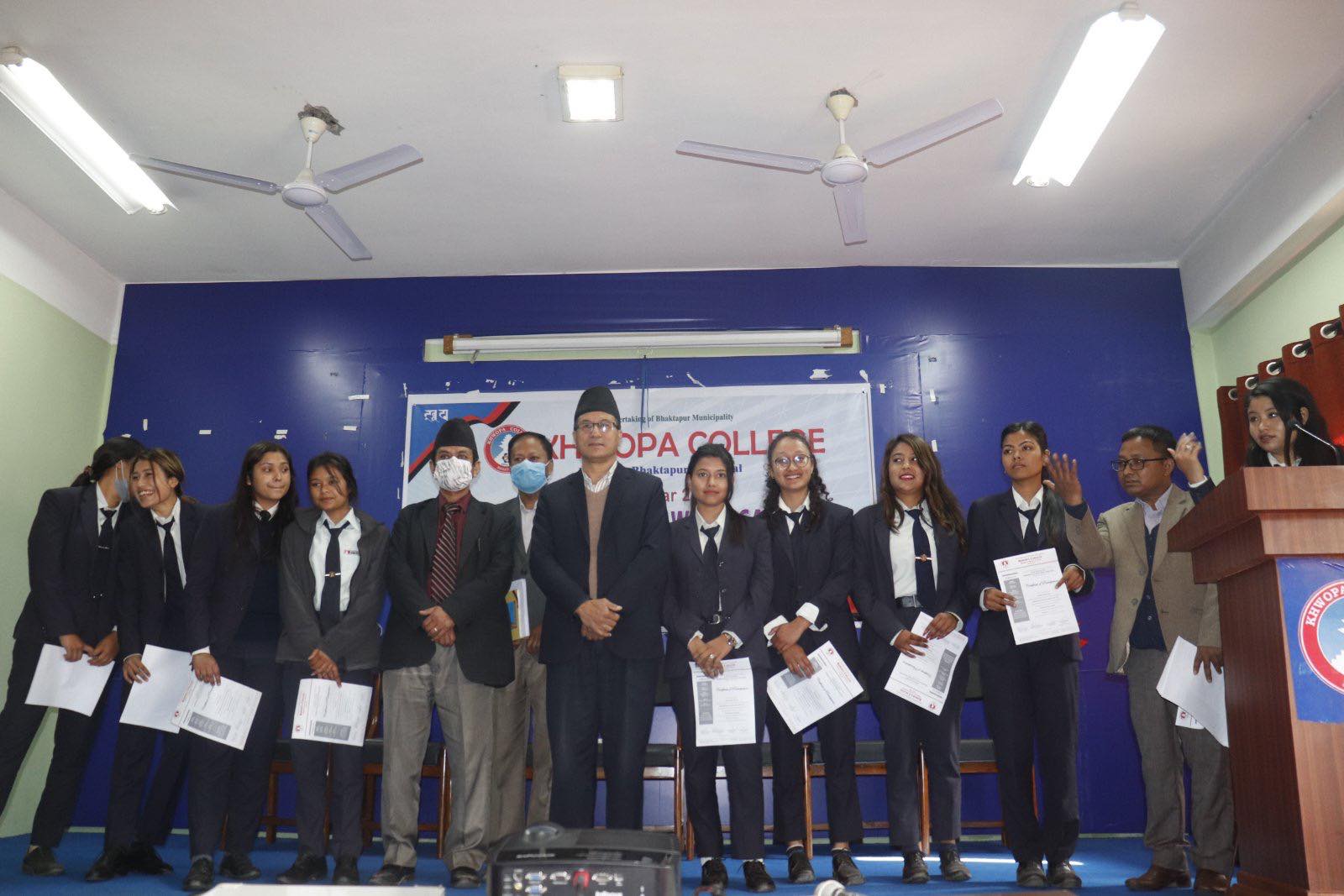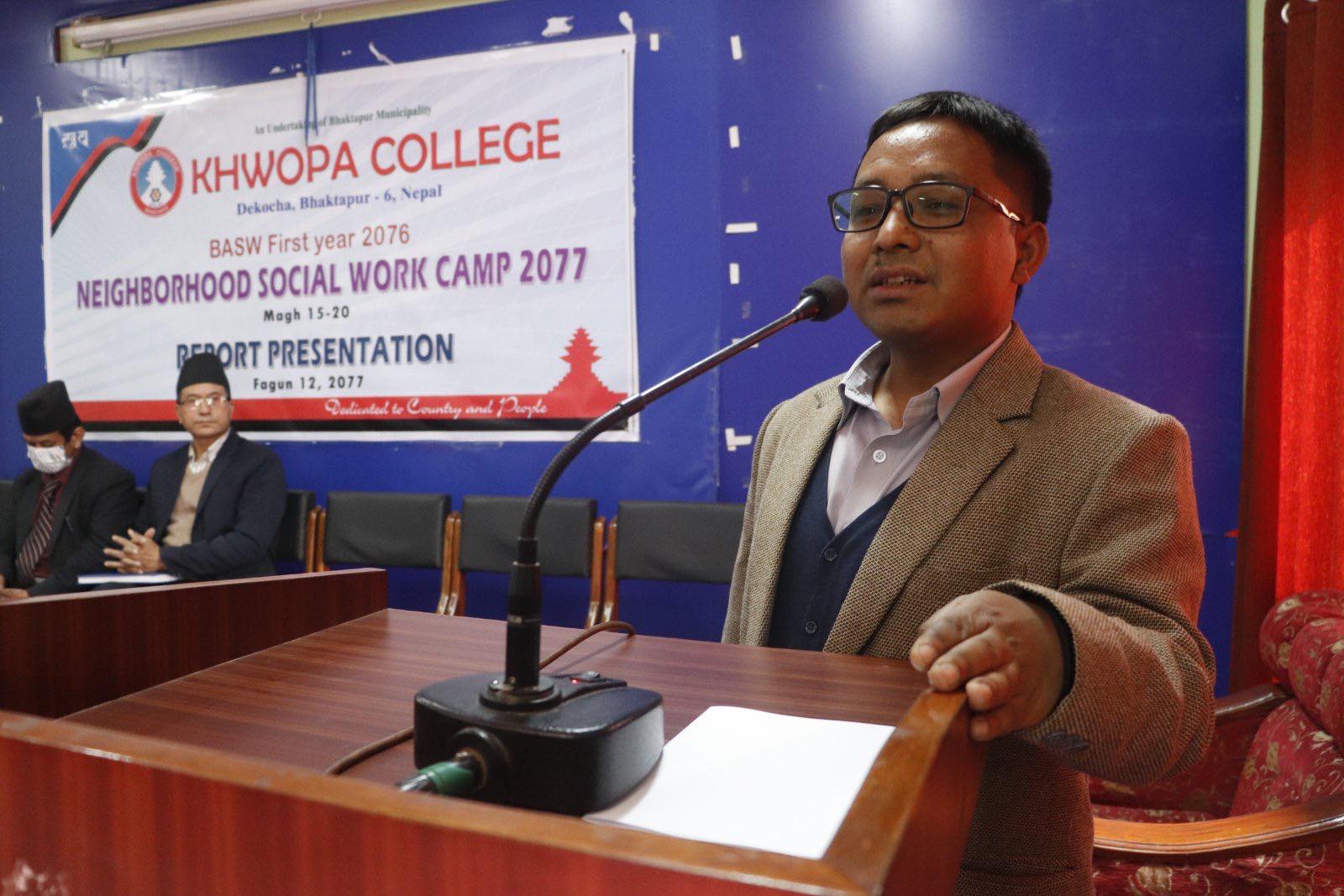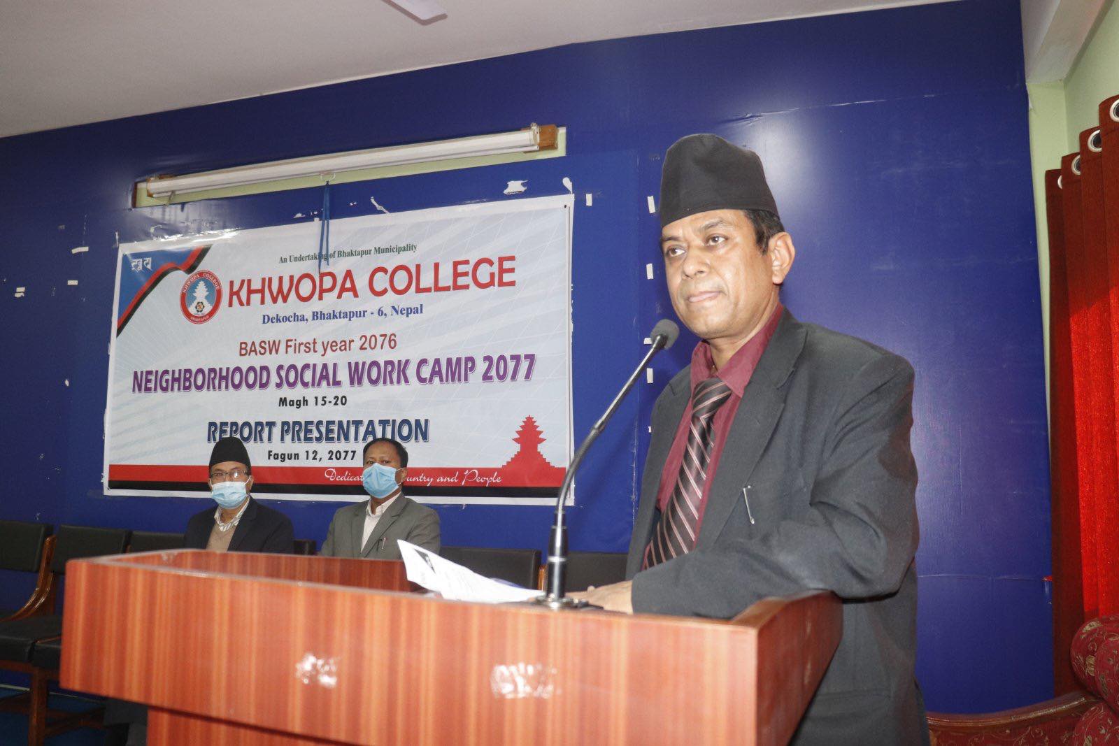 कार्यक्रममा नगर प्रमुख प्रजापतिले ख्वप कलेजमा स्नातक तह बी.ए.एस.डब्लु प्रथम वर्षमा अध्ययनरत विद्यार्थीहरुलाई प्रमाणपत्र वितरण गर्नुभएको थियो । कार्यक्रममा भक्तपुर जिल्लास्थित भक्तपुर नपा, मध्यपुर नपा, सूर्यविनायक नपा र चाँगुनारायण नपाको सामाजिक कार्यबारे गरिएको शिविरको रिपोर्ट प्रस्तुतीकरण देखाएका थिए ।