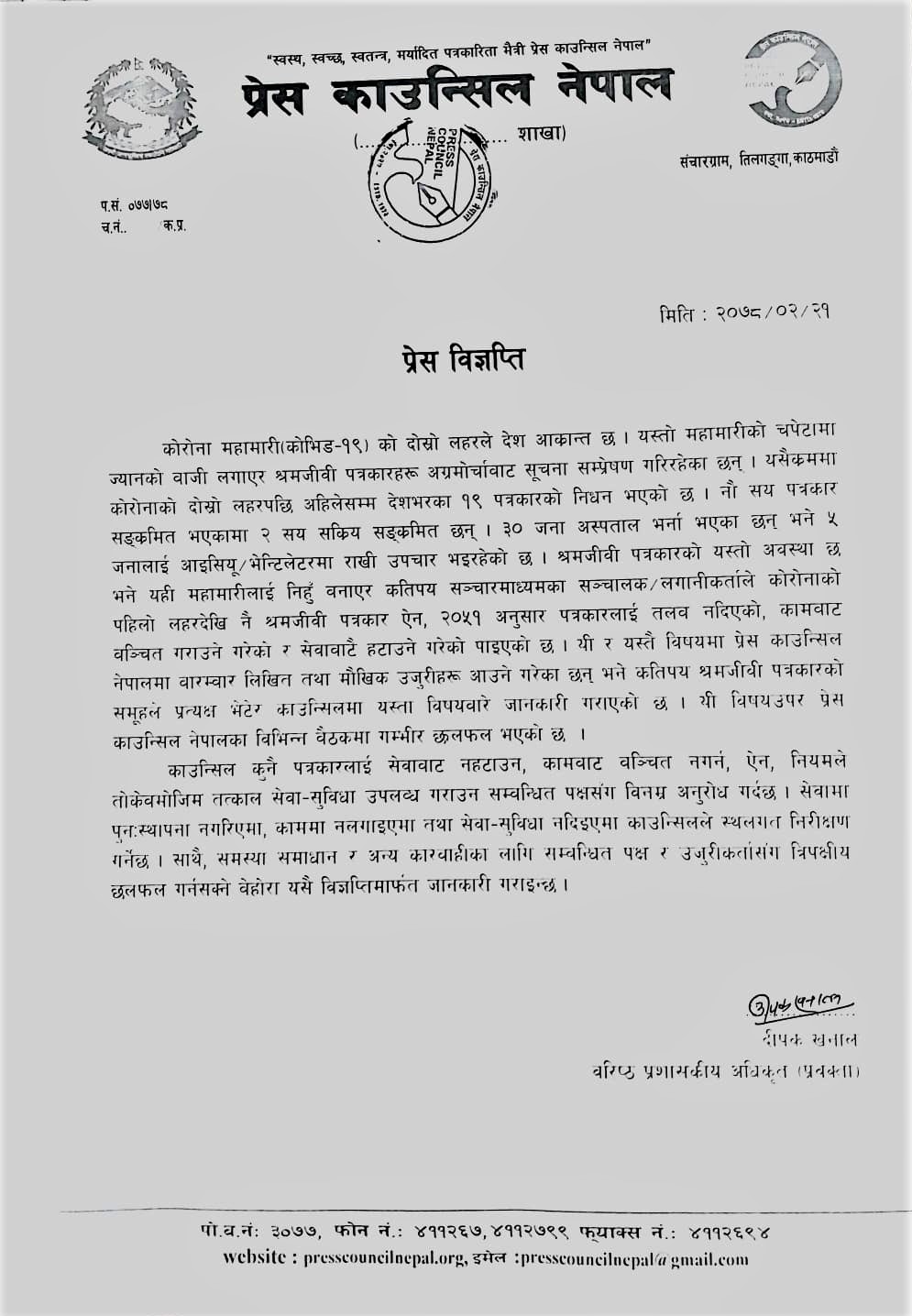 कोरोना महामारी कोभिड–१९ को दोस्रो लहरमा हाल सम्म देशभरका १९ पत्रकारको निधन भएको छ भने नौ सय पत्रकार सङ्क्रमित भएका छन् । प्रेस काउन्सिलका अनुसार यस मध्ये २ सय सक्रिय सङ्क्रमित छन् । ३० जना अस्पताल भर्ना भएका छन् भने ५ जनालाई आइसियू÷भेन्टिलेटरमा राखी उपचार भइरहेको छ । महामारीलाई निहुँ बनाएर कतिपय सञ्चारमाध्यमका सञ्चालक÷लगानीकर्ताले कोरोनाको पहिलो लहरदेखि नै श्रमजीवी पत्रकार ऐन, २०५१ अनुसार पत्रकारलाई तलब नदिएको, कामबाट बञ्चित गराउने गरेको र सेवाबाटै हटाउने गरेको पाइएको पनि काउन्सिलले जनाएको छ । काउन्सिलले कुनै पत्रकारलाई सेवाबाट नहटाउन, कामबाट बञ्चित नगर्न, ऐन, नियमले तोकेबमोजिम तत्काल सेवा–सुविधा उपलव्ध गराउन सम्बन्धित पक्षसँग अनुरोध गरेको छ ।