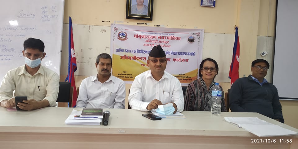 चाँगुनारायण नगरपालिका, शिक्षा, युवा तथा खेलकूद शाखाले प्रारम्भिक कक्षा १ देखि ३ का विद्यार्थीहरुका लागि तयार पारिएको गणित विषयको स्वअध्ययन सामग्री सम्बन्धि अभिमुखीकरण तथा वितरण कार्यक्रम आयोजना गरेको छ ।