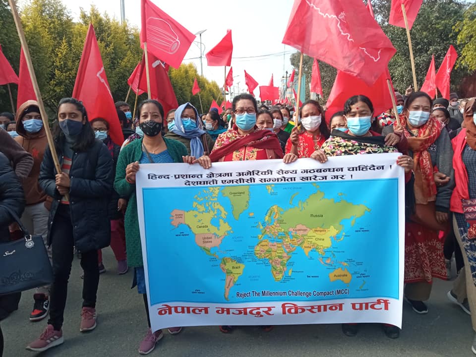 एमसीसी सम्झौता खारेजीको माग गदै नेपाल मजदुर किसान पार्टीले काठमाण्डौमा जुलुस र सभा आयोजना गरेको छ । बानेश्वरस्थित संसद भवन अगाडी तीनतिर धार्ना दिदै एमसीसी खारेजीको माग गरेका हुन । काठमाण्डौको माइतीघर, कोतेश्वर र पुरानो बानेश्वरबाट नयाँ वानेश्वरसम्म नारा जुलुस गर्दै सो पार्टीका नेता कार्यकर्ता र सर्मथकहरुले एमसीसी राष्ट्रघाटी भएको पुष्टि हुदा हुदै रात दिन एमसीसी संसदबाट पारित गर्न खोजेकोले संसद भवन धेर्न आएको बताए ।