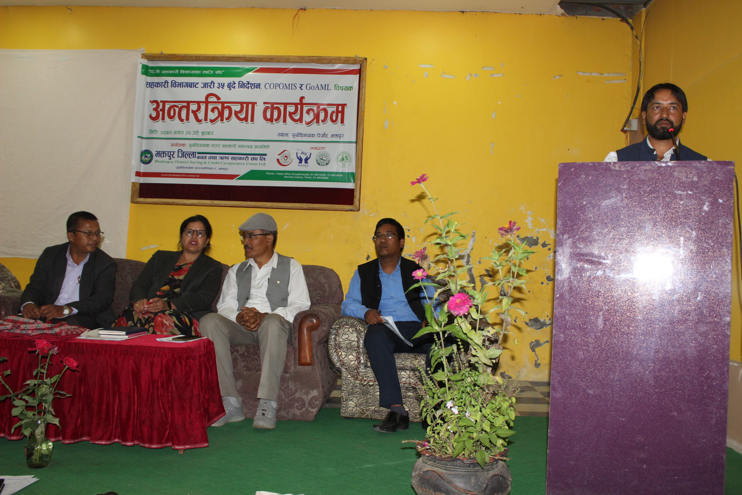कार्यक्रमका सभापति संघका संचालक एवम् उपसमितिका संयोजक काजी बहादुर पञ्चले कार्यक्रममा प्रस्तुत भएको ३५ बुँदे निदेशन, कोपमिस र GoAML मा आबद्ध हुनु अनुरोध गनुभयो । हाल सहकारीमा सुशासनकै अभावमा संचालकले घर जग्गामा लगानी, संचालकको स्वार्थ र कर्मचारीको बदमासीले समस्याहरु देखिएको छ । ती समस्याले गर्दा सहि ढंगले संचालन गरेका सहकारीलाई पनि समस्या पार्ने तर्फ सचेत गराउनुभयो । कार्यक्रममा स्वागत मन्तव्य उपसमितिका सदस्य कंचन कृष्ण न्यौपानेले गर्नुभयो । अन्र्तक्रिया कार्यक्रममा सूर्यविनायक नगरका सहकारी संस्थाका अध्यक्ष र व्यवस्थापक गरी ५४ जनाको सहभागिता रह्यो । कार्यक्रमको संचालन उपसमितिका सदस्य मिठारा न्यौपानेले गर्नुभयो ।