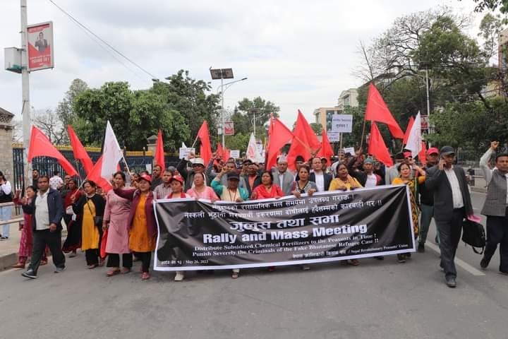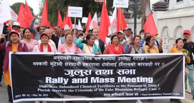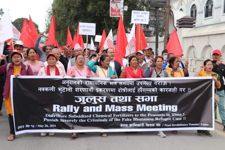 रोपाईको समय नजिकिएसँगै किसानहरुले अनुदानको मल समयमै पाउन सरकारसँग माग गर्दै आज काठमाण्डौमा जुलुस तथा सभा आयोजना गरेको छ । नेमकिपाको भातृसंगठन नेपाल क्रान्तिकारी किसान संघले आयोजना गरेको सो जुलुस र सभाले कृषि उत्पदान बढाउन, देशलाई आत्मनिर्भर बनाउन सरकारको ध्यानाकर्षण गराउँदै नक्कली भुटानी शरनार्थी प्रकरणका दोषिलाई कार्वाहीको माग समेत गरेको छ ।