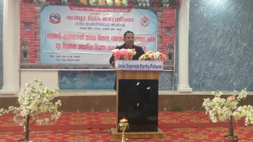सहकारी संस्थाहरुको क्षमता विकास, व्यवसायीकिकरणकालागि दुर शिक्षामा आधारित शिक्षण सामग्री सम्बन्धि चेतना कार्यक्रम समेत आयोजना भएको कार्यक्रममा जिल्ला सहकारी संघका अध्यक्ष केदार थापा, भक्तपुर जिल्ला बचत तथा ऋण सहकारी संघका उपाध्यक्ष तथा मध्यपुर सहकारी समन्वय समितिका संयोजक कान्छा भक्त घजु, जनप्रतिनिधी तथा नगर सहकारी समितिका संयोजक सानुकाजी राजबहाक, नगरपालिकाका प्रमुख प्रशासकीय अधिकृत विजयराज सुबेडी सहितले मन्तव्य राखेकोे सो कार्यक्रमले मध्यपुर थिमीमा प्रधान कार्यालय रहेका सहकारीहरुकालागि नि:शुल्क रुपमा इ विद्या प्रो. सहकारी सफ्टवेयर प्रयोग गर्नदिने घोषणा गरेको छ ।