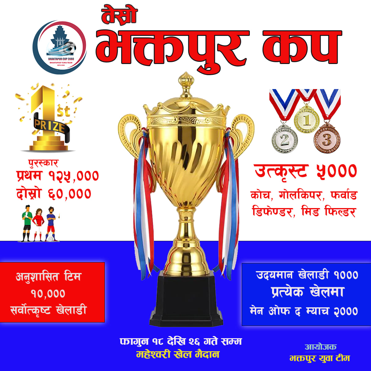 सोमबार हुने ७ औं र ८ औं खेलहरुमा श्री इन्द्र बस गण र बदला एफसी बीच र वी आर ब्रर्दस विरुद्ध चाँगुनारायण नगरपालिका बीच खेल हुने छ। महेश्वरी खेल मैदानमा भइरहेको सो खेल दिउँसो १ बजे र ३ बजे हुने छ । भक्तपुर युवा टिमले आयोजना गरेको सो प्रतियोगिताको फाइनल फाल्गुण २६ गते हुने छ भने भोलि देखि क्वाटर फाइनलका खेलहरु आयोजना हुने छन् ।