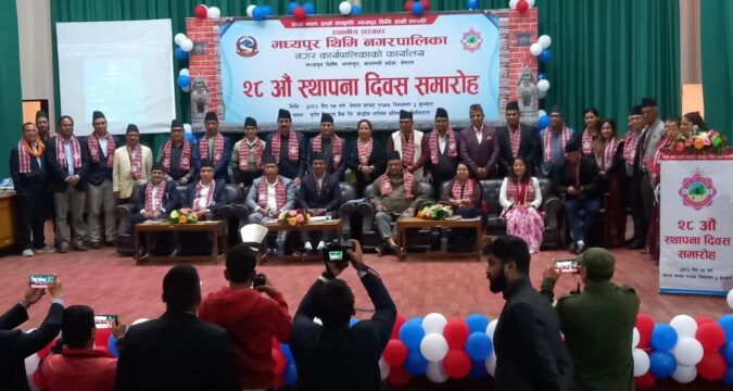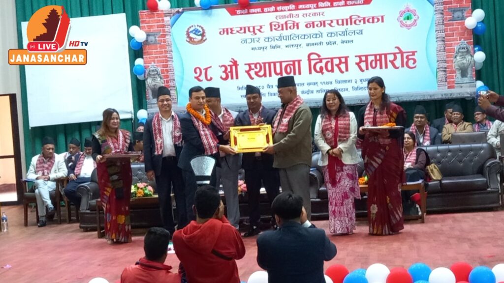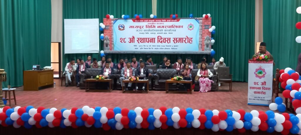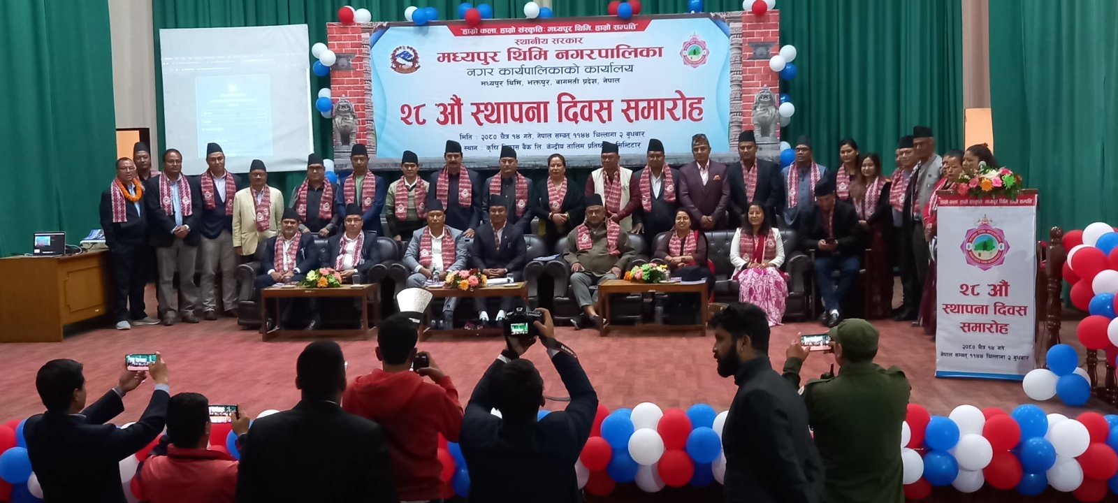 मध्यपुर थिमी नगरपालिकाले आफ्नो २८ औं स्थापना दिवसको अवसरमा सामाजिक अभियान्ता, स्वास्थ्यकर्मी, करदाता, उत्कृष्ठ कार्य गर्ने उपभोक्ता समिति, उत्कृष्ठ कर्मचारीहरुलाई पुरस्कृत गरेका छन् । कृषि विकास तालिम केन्द्रको सभाहलमा आज आयोजित स्थापना दिवसको अवसरमा ऐतिहासिक मध्यपुर थिमीलाई कसरी अगाडी बढाउने भन्ने सवालहरुमा अतिथीहरुले चिन्तन समेत गरेका छन् । २८ औं स्थापना दिवसको उद्घाटन गर्दै भक्तपुर क्षेत्र नंम्वर २का सांसद दुर्लभ थापाले मध्यपुर थिमीलाई ऐतिहासिक बस्ती, नयाँ बस्ती र आर्थिक क्षेत्र गरी तिन किसिमले नगरलाई विकास गर्ने आफ्नो अवधारणा प्रस्तुत गरेका थिए भने बागमति प्रदेश सांसद भावना श्रेष्ठले देशकै उत्कृष्ठ नगरपालिका घोषणासँगै नगरपालिकाको गौरव बढेको जनाउँदै नगर विकासकालागि बागमति प्रदेश सरकारबाट पनि विभिन्न योजनाहरु आएको बताए ।
