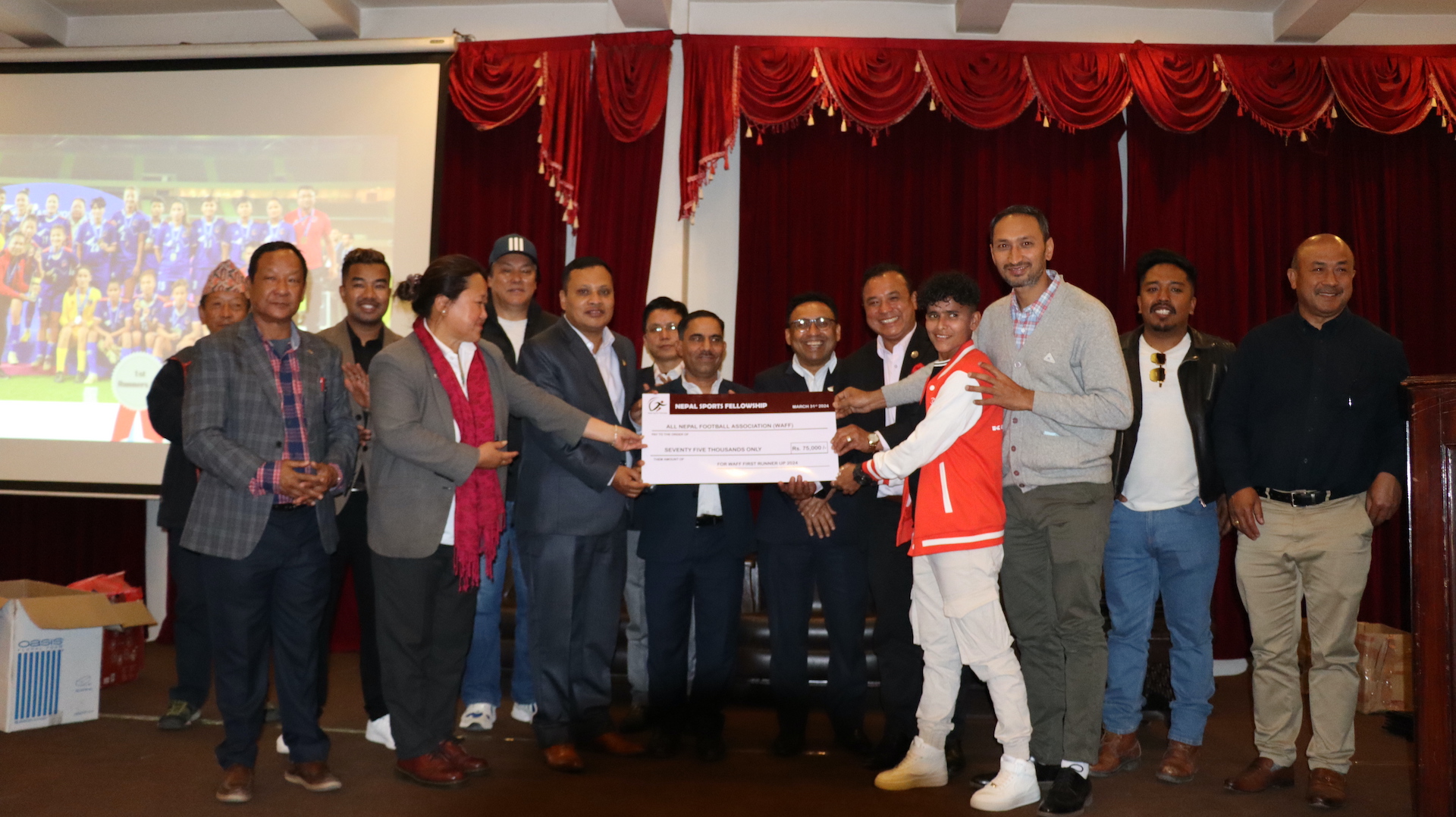 नेपाल स्र्पोटस फेलोसिपले आइतबार पुनरुत्थान (इस्टर)को अवसरमा एक कार्यक्रम आयोजना गर्दै महिला सशक्तिकरण र प्रोत्साह गर्ने उद्देश्यअनुरूप वाफ महिला च्याम्पियनसिपको उपविजेता महिला फुटबलर खेलाडीलाई सम्मानपत्र र ७५ हजार नगद राशीसहित सम्मान गरेको हो ।