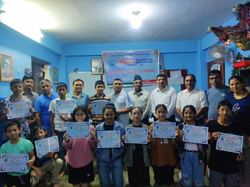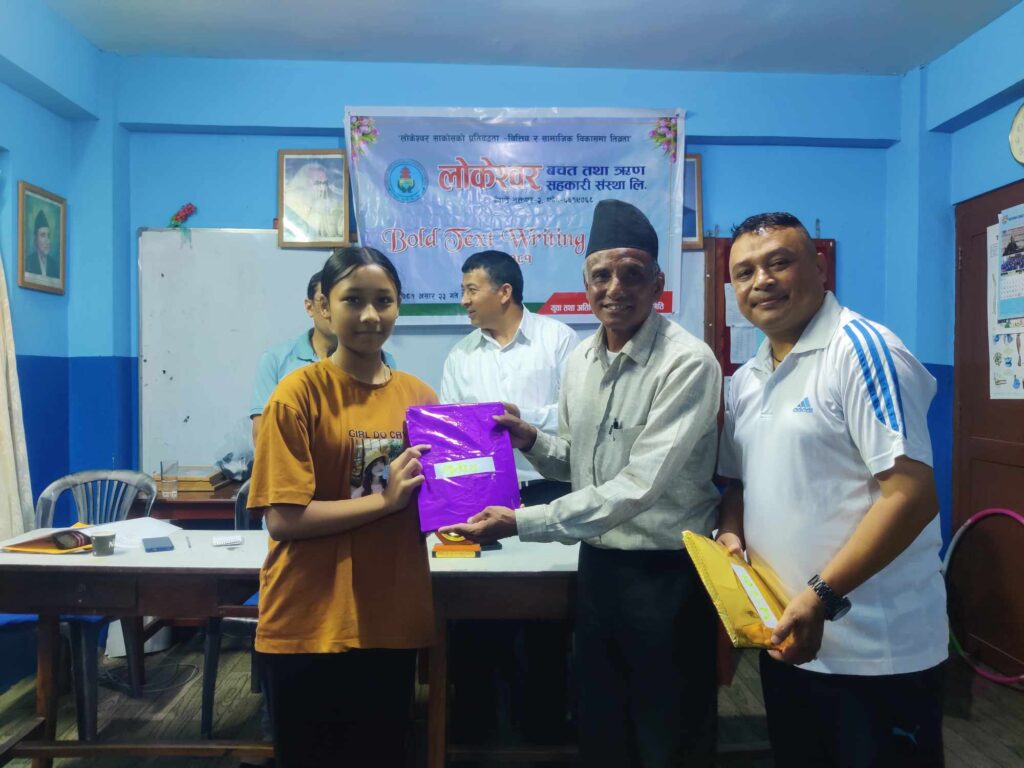 लोकेश्वर बचत तथा ऋण सहकारी संस्था लि.को युवा तथा अतिरिक्त क्रियाकलाप उप–समितिको आयोजनामा भएको एक हप्ते Bold Text Writing तालिमको समापन कार्यक्रम भनपा साविक वडा नं. १५ का पुर्व वडाअध्यक्ष्ँ रविन्द्र खर्बुजाको प्रमुख आतिथ्यतामा सम्पन्न भयो । कार्यक्रममा खर्बुजाले सहकारीबाट विद्यार्थीहरुको जीवनउपयोगि तालिम दिएकोमा खुसी व्यक्त गर्दै सिकेको ज्ञानलाई प्रमाण–पत्रको रुपमा मात्र सिमित नराखी नियमित प्रयोगमा ल्याउन सके सार्थक हुने बताउनु भयो । मानिसको जीवनमा विभिन्न परिस्थितिको सामना गर्नुपर्ने अवस्था आइराख्ने कुरा तर्फ इड्ढित गर्दै अतिथि खर्बुजाले तालिमको महत्व त्यस्तो अवस्थामा हुने औल्याउनु भयो ।