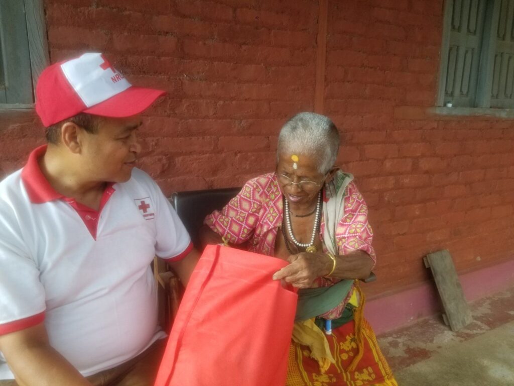 वडा नं १,२,३,६,७,८ र ९ का ५५ एकल तथा असहाय ज्येष्ठ नागरिकहरुलाई वडाका अध्यक्ष तथा सदस्यहरु, भक्तपुर रेडक्रसका पदाधिकारी तथा सदस्यहरु, ज्येष्ठ नागरिक मिलन चौतारीका प्रतिनिधि र सहारा परियोजनाका कर्मचारी तथा रेडक्रसका स्थानीय स्वयंसेवकहरुले घरदैलोमा गई सामाग्रीहरु हस्तान्तरण गर्नुभएको थियो । उहाँहरुले सामग्री सहित नगर प्रमुख तथा रेडक्रसका सभापतिको तर्फबाट सुस्वास्थ्य तथा दिर्घायुको कामना उल्लेखित शुभकामना कार्ड दिनुहुदै चाँगुनारायण नगरपालिका ज्येष्ठ नागरिकहरुको सुखदुःखमा सदैब साथ रहने कुरा पनि बताउनुभएको थियो । सामग्रीको झोलामा फलफुल, विस्कुट, किटनाशक झुल तथा मास्क राखिएको थियो । वडा तथा ज्येष्ठ नागरिक मिलन चौतारीसंगको सहकार्य र समन्वयमा सुचीकरण गरिएका ज्येष्ठ नागरिकहरुलाई फलफुल सहितको सामग्रीहरु वितरण गरिएको थियो ।