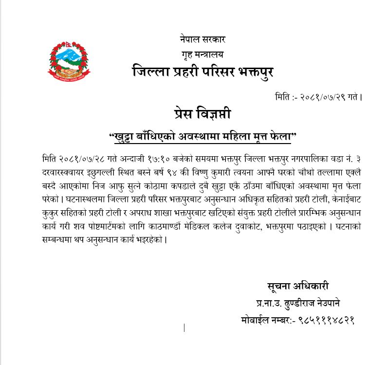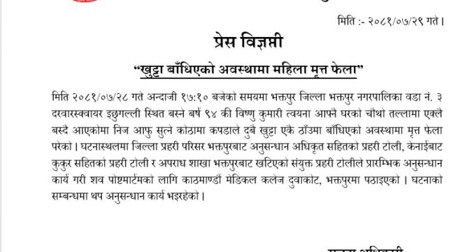 भक्तपुर नगरपालिका वडा नं. ३ दरवारक्षेत्रस्थित इछुगल्लीमा ९४ वर्षकी विष्णु कुमारी त्वयना आफ्नै घरको चौथो तल्लामा खुट्टा बाँधिएको अवस्थामा मृत्त अवस्थमा फेला परेको छ । एक्लै बस्दै आएका त्वायना आफु सुत्ने कोठामा कपडाले दुबै खुट्टा एकै ठाँउमा बाँधिएको अवस्थामा मृत्त फेला परेको जिल्ला प्रहरी परिसर भक्तपुरले जनाएको छ । घटनास्थलमा प्रहरीको अनुसन्धान अधिकृत सहितको टोली, केनाईबाट कुकुर सहितको प्रहरी टोली र अपराध शाखा भक्तपुरबाट खटिएको संयुक्त प्रहरी टोलीले प्रारम्भिक अनुसन्धान कार्य गरी शव पोष्टमार्टमको लागि काठमाण्डौ मेडिकल कलेज दुवाकोट भक्तपुरमा पठाएको प्रहरीले जनाएको छ । मृतक त्वयनाको आज हनुमनाघाटमा अन्त्यस्ति गरेको छ । घटना बारे थप अनुसन्धान कार्य भइरहेको प्रहरी परिसर भक्तपुरका सूचना अधिकारी ढुण्डीराज नेउपानेले जनाएको छ ।
