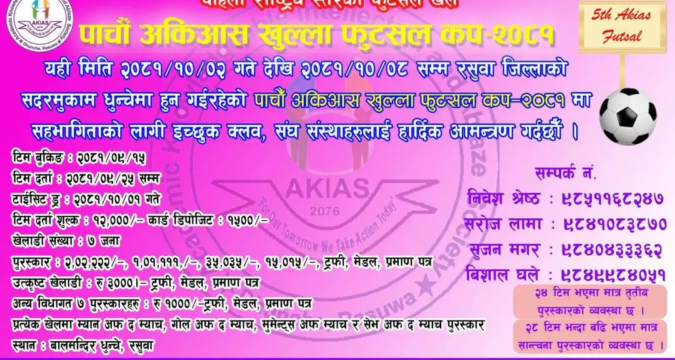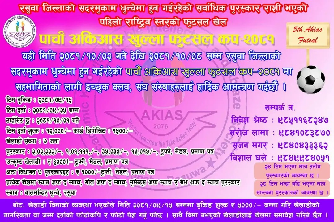 रसुवाको सदरमुकाम स्थित धुन्चेमा आगामी माघको पहिलो साताबाट जिल्लाकै सर्वाधिक पुरस्कार राशिको पाँचौँ अकिआस खुल्ला फुटसल कप २०८१ प्रतियोगिता सञ्चालन हुने भएको छ ।