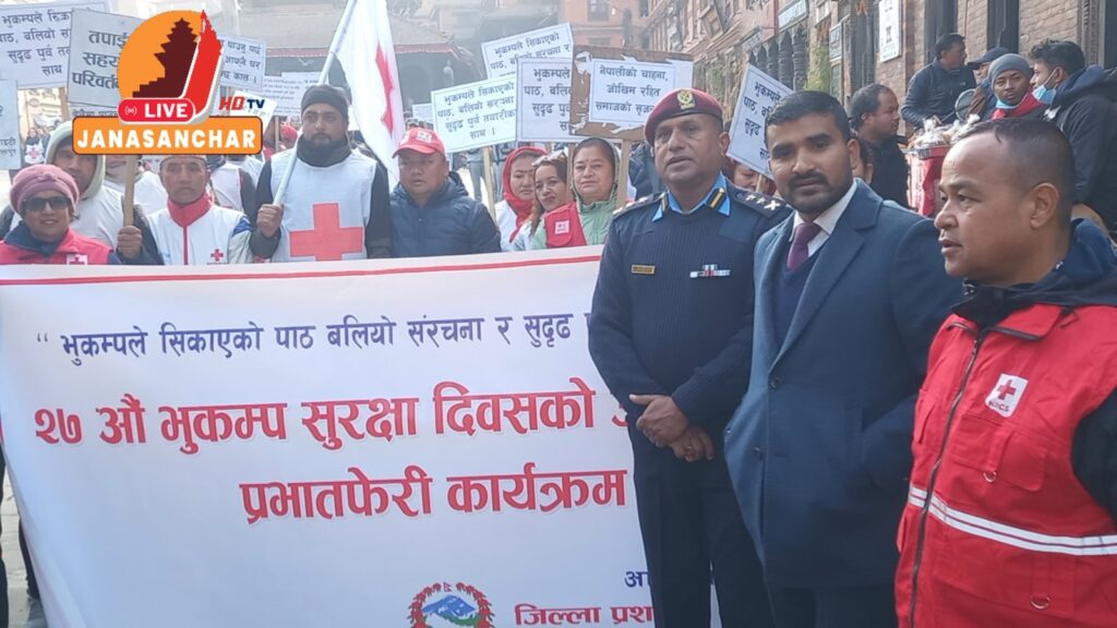 २७ औं राष्ट्रिय भूकम्प सुरक्षा दिवसको अवसरमा जिल्ला प्रशासन कार्यालय भक्तपुरले जनचेतनामूलक प्रभातफेरी तथा कृतिम घटना पूर्वाभ्यास गरेको छ । भक्तपुरको दत्तात्रय मन्दिरपरिसर देखि तौमढीसम्म भूकम्पीय सुरक्षा बारे व्यानर र प्लेकार्ड सहित प्रभात फेरी गर्दै तौमढीमा भूकम्प आउँदा विद्यालय कक्षाबाट कसरी सुरक्षत रुपले बाहिर आउने?, भूकम्पले घर सम्रचना भत्किदा थिचिएका पुरिएकाहरुको उद्धार, प्राथमिक उपचार तथा स्वास्थ्य उपचार गर्ने तरतरिकाहरुको जानकारी दिदै उद्धार उपकरहरुको प्रदर्शनी गर्दै कृतिम घटना पूर्वाभ्यास कार्यक्रम आयोजना गरेको छ ।