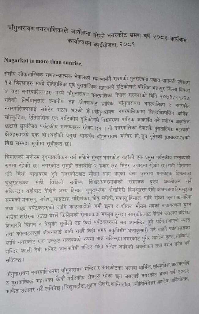 आगामी बैशाख १ गते देखि वर्ष भरी मनाउने नगरकोट भ्रमण वर्ष २०८२का कार्यक्रम कार्यन्वयन कार्ययोजना २०८१ आज सार्वजनिक भएको छ । आयोजक चाँगुनारायण नगरपालिकाले आज नगरपालिकाको सभाहलमा बृहत्त बैठक आयोजना गर्दै नगरकोट भ्रमण वर्ष २०८२ कार्यक्रमका कार्ययोजनाहरु प्रस्तुत गरेका हुन ।