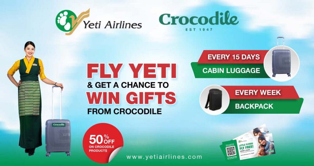 यती एअरलाइन्समा उडान भर्ने यात्रुहरुले क्रोकोडाईल लगेज तथा ब्यागप्याकमा हात खालि नजाने उपहार पाउने भएका छन् । फेब्रुअरी, मार्च र अप्रिल महिनामा यती एअरलाइन्स बाट यात्रा गर्ने यात्रुहरुले क्रोकोडाईल लगेजको खरिदमा ५० प्रतिशत सम्मको छुट प्राप्त गर्नेछन् ।