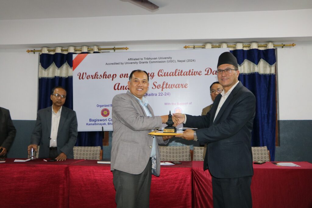 भक्तपुर, २४ चैत । वागीश्वरी कलेजमा क्वालिटेटिभ डेटा एनालाइसिस सफ्टवेयर प्रयोगसम्बन्धी तीनदिने कार्यशाला आइतबार सम्पन्न भएको छ । तालिममा सहभागी फ्याकल्टी सदस्यहरूलाई वागीश्वरी कलेज व्यवस्थापन समितिका अध्यक्ष एवं भक्तपुर नगरपालिकाका प्रमुख सुनिल प्रजापतिले प्रमाणपत्र वितरण गनुर््भयो ।