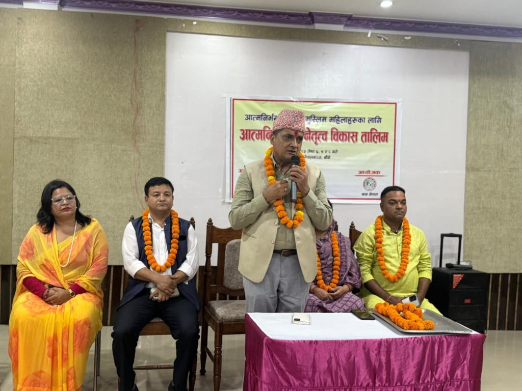 नेपालगन्ज÷ मुस्लिम महिलाहरुका लागि आत्मनिर्भर एबँ नेतृत्व बिकास सम्बन्धी तीन दिने तालिम नेपालगन्जमा सुरु भएको छ । सामाजिक बिकास डिभिजन कार्यालय बाँकेको सहयोग र बास नेपालको आयोजनामा भएको तालिमको लुम्बिनी प्रदेशका सामाजिक बिकास मन्त्री जन्मजय तिमिल्सिनाले मंगलबार उद्घाटन गरेका छन् । तालिमको उद्घाटन समारोहलाइ सम्बोधन गर्दै सामाजिक बिकास मन्त्री तिमिल्सिनाले महिलाहरुको क्षमता विकास गरी आत्मनिर्भर बनाउने उद्देश्यले तालिमको आयोजना गरिएको बताउदै तालिममा महत्वका साथ सहभागी भइ सिक्नुपर्ने बताए । मन्त्रि तिमिल्सिनाले मुस्लिम समुदायमाका महिलाहरुले विभिन्न समस्याहरुको सामना गर्नु परिरहेको बताउदै आफ्नो हक अधिकारका लागि पैरबी गर्न आवश्यक रहेको बताए ।