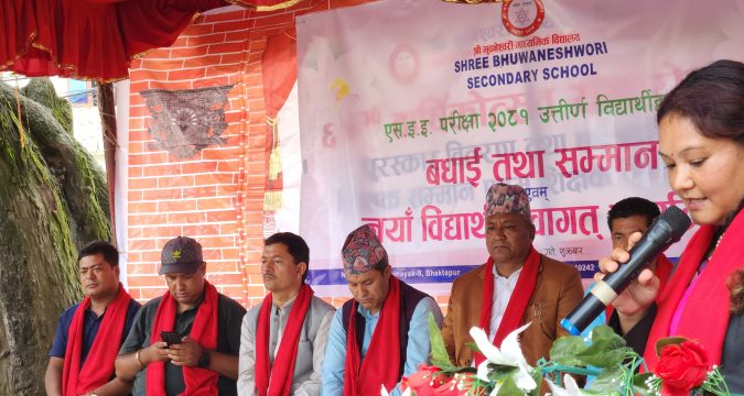 भक्तपुर, साउन १६ गते, भक्तपुरको सूर्यविनायक नगरपालिका-९, नङखेलस्थित श्री भुवनेश्वरी माध्यमिक विद्यालयमा शैक्षिक उपलब्धि, सेवा र स्वागतलाई सम्मान गर्ने उद्देश्यका साथ एक भव्य कार्यक्रम सम्पन्न गरिएको छ । सो अवसरमा विद्यालयले २०८१ सालको एसईई परीक्षा उत्तीर्ण गरेका विद्यार्थीहरूलाई सम्मान, नवआगन्तुक विद्यार्थीहरूलाई स्वागत र विद्यालयमा समर्पित भावनाका साथ कार्यरत शिक्षक तथा कर्मचारीहरूलाई सम्मानपत्रसहित सम्मान गरेको हो ।