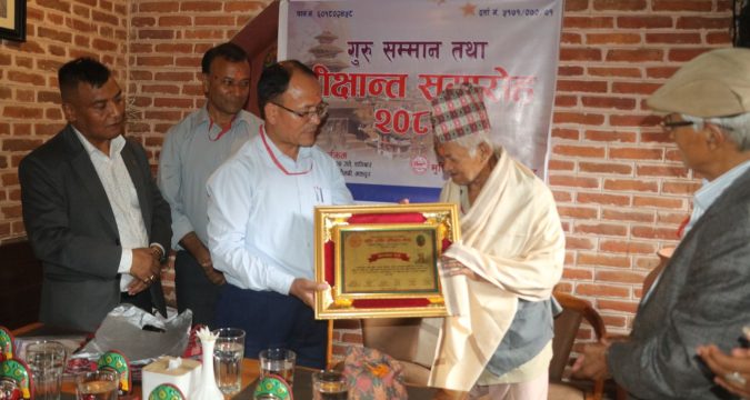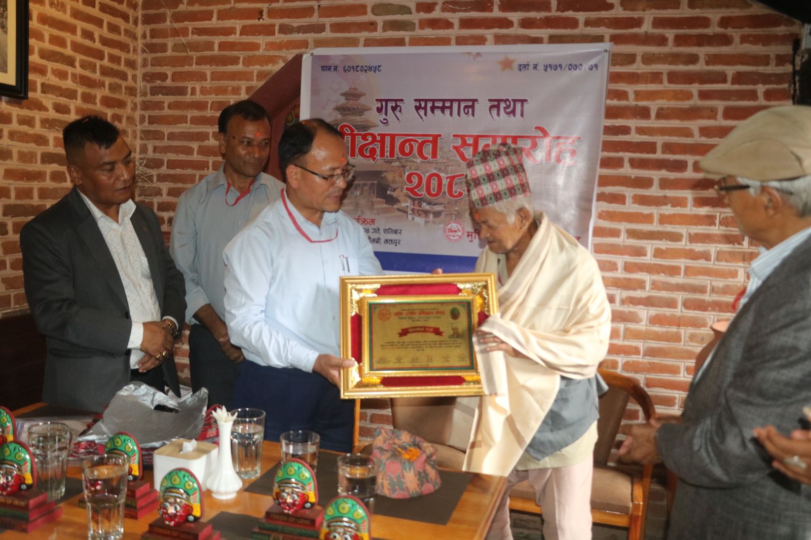 विद्यार्थीहरुले पढेर पास गरेर मात्र होइन सो विषयको विज्ञता हासिल गर्नुपर्नेमा जोड दिदै बागमती प्रदेशका सांसद सुरेन्द्रराज गोसाईले मुक्ति संगीत प्रशिक्षण केन्द्रका गुरु सम्मानित तथा प्रशिक्षार्थीहरुलाई शनिबार दिक्षित गरेका छन् । गरुडा होटल तौमढीको सभाहलमा आयोजित सो कार्यक्रममा स्थानीय संस्कृतिविदलाई सम्मानित गर्दै सांसद गोसाईले स्थानीय संस्कृति र सभ्यता संरक्षण गर्न नयाँ पुस्तालाई निरन्तर प्रशिक्षण दिनुपर्नेमा जोड दिनु भयो । उहाँले आफ्नो मातृभाषा छोडेर अरु भाषा बोलेर भाषा संस्कृति संरक्षण हुन नसक्ने बताउनु भयो । सस्कृति अभियान्ता गणेशराम लाछिले भक्तपुरमा मुक्ति संगीतले नयाँ पुस्तामा परम्परागत नाँच गान र बाजाहरु सिकाएर संस्कृति संरक्षणमा अतुलनयिा योगदान गर्दै आएको चर्चा गर्दै ख्वप विश्वविद्यालय स्थापनासँगै अझै थप संस्कृति सभ्यता संरक्षण गर्न सक्षम हुने धारणा राख्नु भयो भने स्थानीय जनप्रतिनिधी उपेन्द्र सुवालले गाईजात्रा जस्तै नगरका साँस्कृतिक वर्ष, जात्राहरुलाई व्यवस्थित रुपमा सञ्चालन गर्न नगरपालिकाले आह्वान गर्दै आएको उल्लेख गर्दै उहाँले विक्रृति रहित सभ्य रुपमा पर्व मनाउन आग्रह गर्नु भयो । भक्तपुरका विद्यार्थीहरुलाई सहुलियत पूर्ण शैक्षिक ऋण र छात्रवृद्धि दिएर उच्च शिक्षा हासिल गर्न नगरपालिकाले सहयोग गर्दै आएको बताउँनु भयो । नेपाल चेम्बर अफ कमर्शका केन्द्रीय सदस्य रोशन भ्योद्यले मुक्ति संगीतबाट प्रशिक्षण पाएका कलाकारहरुबाट देश विदेशका पाहुनाहरुलाई देवी नाँच लगायत विभिन्न साँस्कृतिक झाँकीहरुबाट स्वागत गर्न पाएकोमा खुसी व्यक्त गर्नु भयो । नयाँ पुस्तालाई पुख्यौली कला प्रशिक्षणमा अझ महिला अग्रसर हुनु गौरवको विषय भएको भन्दै यस्तो खालको प्रशिक्षण निरन्तर हुनुपर्नेमा जोड दिनु भयो । मुक्ति सगीत प्रशिक्षण केन्द्रका संस्थापक मुक्ति सुन्दर जधारीको जन्म दिनको अवसरमा आयोजित सो कार्यक्रम रोशिका जधारीको सभापतित्वमा सम्पन्न भएको थियो भने सो अवसरमा रोशिक जधारीले कार्यक्रम सफल पार्न सहयोग गर्ने सबैलाई धन्यवाद ज्ञापन गर्नु भयो ।