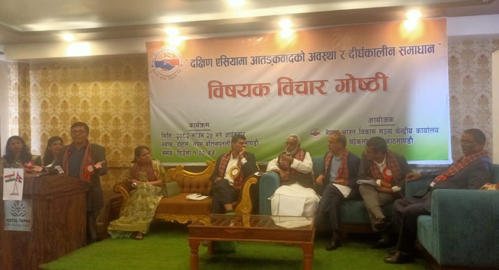 काठमाडौं । नेपाल–भारत विकास मञ्चले काठमाडौंमा ‘दक्षिण एसियामा आतंकवादको अवस्था र दीर्घकालीन समाधान’ विषयक विचार गोष्ठी सम्पन्न भएको छ । आइतबार काठमाडौंको बतिसपुतलीस्थित होटल तपसमा भएको सो विचार गोष्ठीमा विभिन्न राजनीति दलका शीर्ष नेताहरुले आआफ्नो धारणा राखेका थिए ।