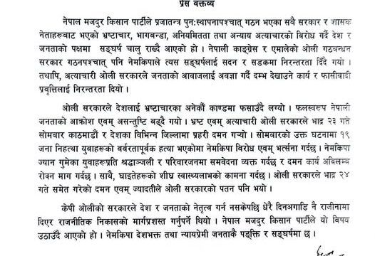 नेपाल मजदुर किसान पार्टीले हिजो भएको १९ जना निहत्था युवाहरूको वर्बरतापूर्वक हत्या भएकोमा विरोध एवम् भत्र्सना गरेको छ । नेमकिपा सचिव प्रेम सुवालले आज जारी गरेको विज्ञप्ति मार्फत भत्र्सना गरेको हो । प्रजातन्त्र पुनःस्थापनापश्चात् गठन भएका सबै सरकार र शासक नेताहरूबाट भएको भ्रष्टाचार, भागवन्डा, अनियमितता तथा अन्याय अत्याचारको विरोध गर्दै देश र जनताको पक्षमा सङ्घर्ष चालु राख्दै आएको हो। नेपाली काङ्ग्रेस र एमालेको ओली गठबन्धन सरकार गठनपश्चात् पनि नेमकिपाले त्यस सङ्घर्षलाई सदन र सडकमा निरन्तरता दिँदै गयो । तथापि, अत्याचारी ओली सरकारले जनताको आवाजलाई अवज्ञा गर्दै दम्भु देखाउने कार्य र फासीवादी प्रवृत्तिलाई निरन्तरता दियो । ओली सरकारले देशलाई भ्रष्टाचारका अनेकौं काण्डमा फसाउँदै लग्यो । फलस्वरूप नेपाली जनताको आक्रोश एवम् असन्तुष्टि बढ्दै गयो। भ्रष्ट एवम् अत्याचारी ओली सरकारले भाद्र २३ गते सोमवार काठमाडौं र देशका विभिन्न जिल्लामा प्रहरी दमन गर्यो। सोमबारको उक्त घटनामा १९ जना निहत्था युवाहरूको वर्बरतापूर्वक हत्या भएकोमा नेमकिपा विरोध एवम् भत्र्सना गर्दछ । नेमकिपा ज्यान गुमेका युवाहरूप्रति श्रद्धान्जली र परिवारजनमा समवेदना व्यक्त गर्दछ र दमन कार्य अविलम्व रोक्न माग गर्दछ । साथै, घाइतेहरूको शीघ्र स्वास्थ्यलाभको कामना गर्दछ। ओली सरकारले भाद्र २४ गते समेत गरेको दमन एवम् ज्यादतीले ओली सरकारको पतन पनि भयो । केपी ओलीको सरकारले देश र जनताको नेतृत्व गर्न नसकेपछि धेरै दिनअगाडि नै राजीनामा दिए राजनीतिक निकासको मार्गप्रशस्त गर्नुपर्ने थियो। नेपाल मजदुर किसान पार्टीले यो विषय उठाउँदै आएको हो । नेमकिपा देशभक्त तथा न्यायप्रेमी जनताकै पक्ति र सङ्घर्षमा छ । सचिव सुवालद्वारा जारी विज्ञप्तिमा भनिएको छ ।