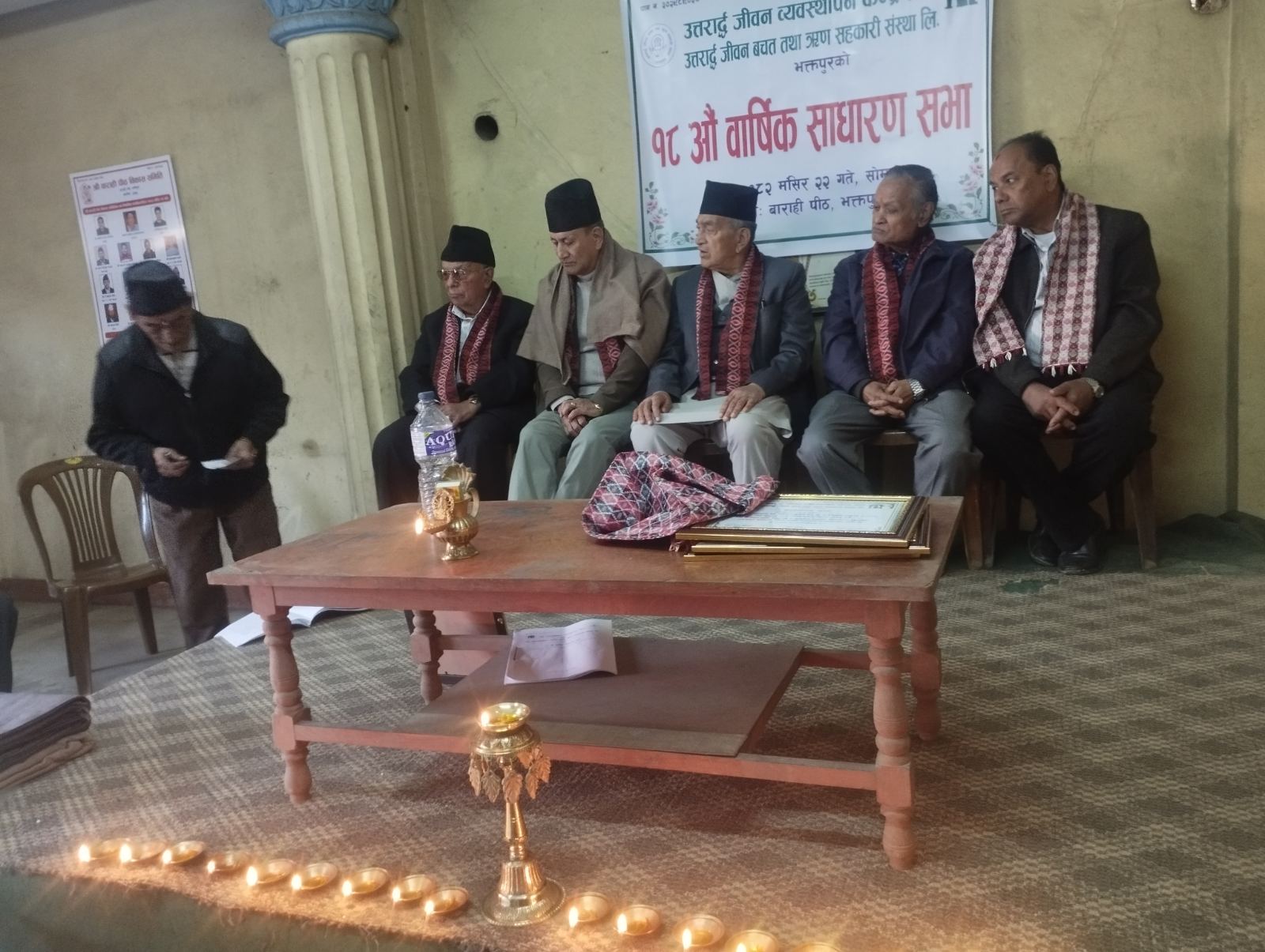 उतरार्द्ध जीवन व्यवस्थापन केन्द्र तथा उतरार्द्ध जीवन वचत तथा ऋण सहकारी संस्था लि.काे स्थानीय वाराही पीठ, भक्तपुरमा सम्पन्न १८ आैं साधारण सभामा प्रमुख अतिथि डा. अरविन्दलाल भाेमीले उतरार्द्ध उन्मुख सदस्य तथा जेष्ठ सदस्यहरूलाई सहकारीले तिनीहरूकाे जीवन यापनकाे व्यवस्थापनमा राज्यले दिंदै आएकाे सेवा सुविधाबारे अवगत गराई सहजिकरण गर्नुपर्ने बताउनुभयाे ।