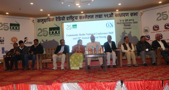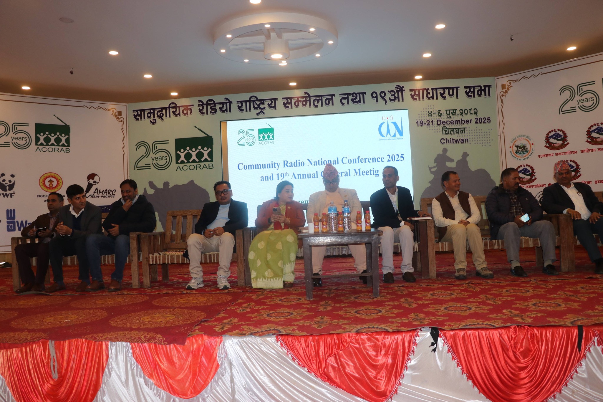 सामुदायिक रेडियो प्रसारक संघ ९अकोराब० नेपालको १९ औँ साधारण सभा तथा सामुदायिक रेडियो राष्ट्रिय सम्मेलन सौराहा घोषणा पत्र– जारी गर्दै सम्पन्न भएको छ । चितवन जिल्लाको सौराहामा पुस ४ र ५ मा सम्पन्न सामुदायिक रेडियो प्रसारक संघ ९अकोराब० नेपालको १९ औँ साधारण सभा तथा सामुदायिक रेडियो राष्ट्रिय सम्मेलन पश्चात् जारी सौराहा घोषणा पत्र मार्फत संकटमा परेका सामुदायिक रेडियोलाई सहयोग गर्न सरकारसँग माग गरिएको छ । देशभरका सामुदायिक रेडियोका प्रसारक एवं सञ्चालकहरूले नागरिकलाई सत्य तथ्य समाचार तथा जानकारी प्रसारण गर्न प्रतिबद्धता व्यक्त गर्दै अभिव्यक्ति स्वतन्त्रता र आवाजविहिनहरुको आवाजका लागि नागरिकको सूचनाको हकको संरक्षण र सम्बद्र्धन, लोकतन्त्र, मानवअधिकार र बहुलवाद आत्मसाथ गर्दै, आत्मसम्मान सहितको जीवनशैली, भाषा, संस्कृति संरक्षण गर्दै, हानिकारक परम्परागत अभ्यासको अन्त्य गरी पारदर्शिता र जबाफदेहिता अभिवृद्धि गर्न सहयोग गर्दै सामाजिक रूपान्तरणका क्षेत्रहरूमा क्रियाशील हुँदै, सामुदायिक रेडियोहरूले वर्तमान समयमा सामना गर्नु परेका आर्थिक तथा नीतिगत चुनौतीको सम्बोधन एवं डिजिटल क्षेत्रले ल्याएका चुनौतीलाई सामना गर्दै त्यसलाई अवसरको रूपमा उपयोग गर्ने प्रतिवद्धता व्यक्त गर्दै बिभिन्न माग सहित सौराहा घोषणा पत्र जारी गरेका हुन् । प्रसारकहरुले सङ्गीत रोयल्टीको नाममा गैर कानुनी तवरबाट सामुदायिक रेडियोलाई उच्च आर्थिक दबाब पर्ने गरिएको व्यवस्थाको खारेजको माग गरेका छन् । सङ्घीय र प्रदेश सरकारले गरेको व्यवस्था झैँ स्थानीय सरकारले पनि जिल्लामा रहेका सामुदायिक रेडियोहरू सूचीकृत गरी समानुपातिक ढङ्गले लोककल्याणकारी विज्ञापन वितरण गर्ने नीतिगत व्यवस्थाका लागि माग गरेका छन् । घोषणा पत्र यसैसाथ संलग्न गरिएको छ ।