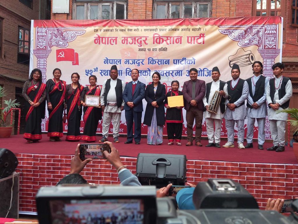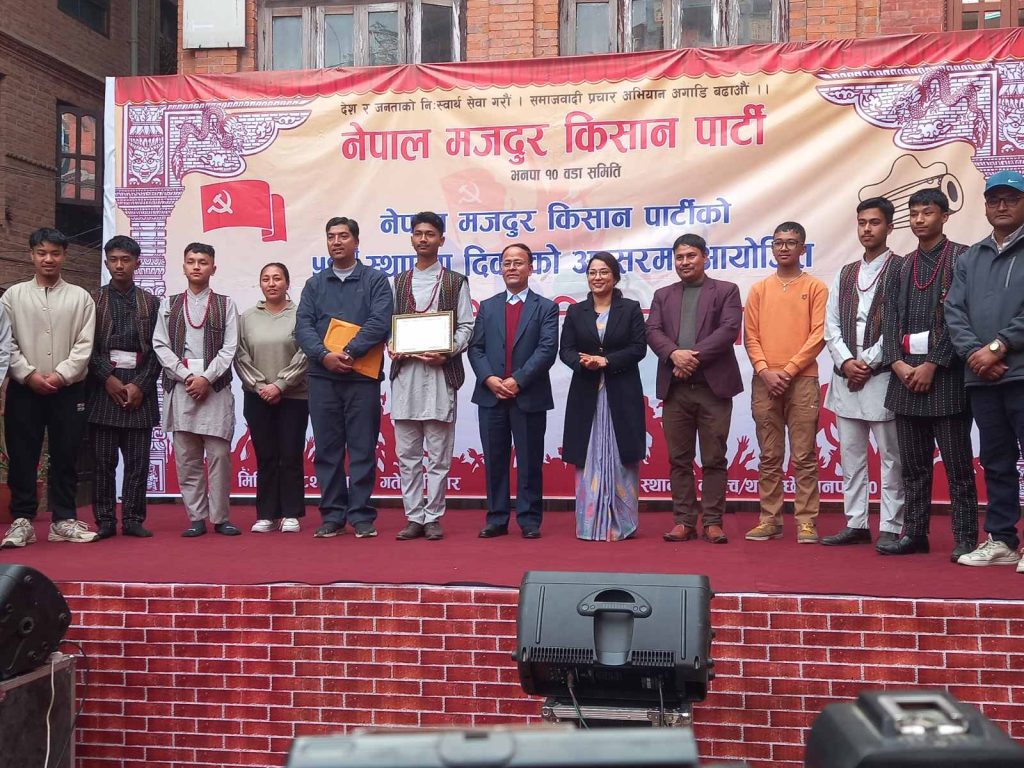 नेपाल मजदुर किसान पार्टीको ५२ औं स्थापना दिवसको अवसरमा आयोजित भक्तपुर नगर व्यापी प्रगतिशील गीत प्रतियोगितामा बागीश्वरी मावि प्रथम, कमिचागल्ली दिदी बहिनी समूह दोस्रो, जेन्युइन सेकेण्डरी स्कुल तेस्रो र जेँला सांस्कृतिक समाज सान्त्वना भएका छन् । आज भक्तपुर नगरपालिका वडा नं. १०को दथुत्वमा आयोजित प्रतियोगितामा प्रस्तुत २३ वटा गीतहरु मध्ये उत्कृष्ठ प्रतियोगिहरुलाई आजै पुरस्कृत गरिएको छ ।