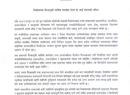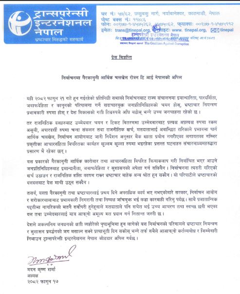 निर्वाचनमा गैरकानुनी आर्थिक चलखेल रोक्न टान्सपरेन्सी इन्टर नेशनल नेपाल (टि आई नेपाल)को अपिल गरेको छ । टिआई नेपालका अध्यक्ष मदनकृष्ण शर्माले आज एक प्रेस विज्ञप्ति जारी गर्दै निर्वाचनमा गैरकानुनी आर्थिक चलखेल रोक्न आग्रह गर्दै फागुन २१ गते हुन गईरहेको प्रतिनिधी सभाको निर्वाचनबाट राज्य संचालनमा इमान्दारिता, पारदर्शिता, जवाफदेहिता र कानुनको परिपालना गर्ने सदाचारयुक्त जनप्रतिनिधिहरुको चयन होस्, भ्रष्टाचार नियन्त्रण प्रभावकारी रुपमा होस् र देश विकासको गती तिव्ररुपले अघि बढोस् भन्ने उच्च जनचाहना रहेको जनाएका छन् ।