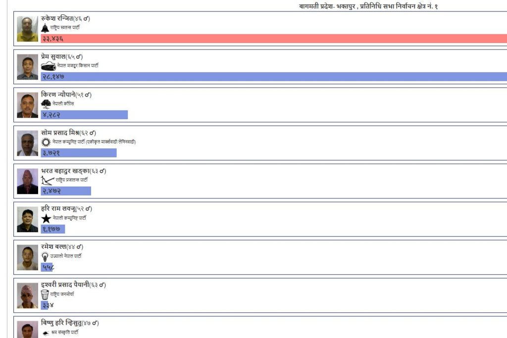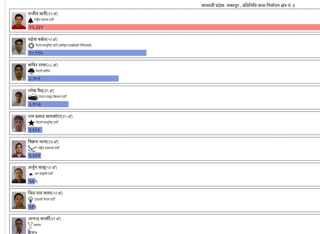 यसै गरी भक्तपुर निर्वाचन क्षेत्र नं. २मा नेकपा एमालेका महेश बस्नेत सूर्यले १०९९६ मत प्राप्त गर्दा राष्ट्रिय स्वतन्त्र पार्टी घण्टीका राजीव खत्रीले३१३३८ मतान्तरले ४२,३३४ मत प्राप्त गरी विजयी भएको छ । विजयी उम्मेदबारहरुलाई आजै निर्वाचन अधिकृतहरुले प्रमाण पत्र हस्तान्तरण गरेका छन् ।