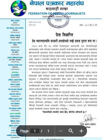 काठमाडौं । प्रधानमन्त्री तथा मन्त्रिपरिषद्को कार्यालयले सार्वजनिक खरिदसम्बन्धी सूचनाहरू केवल सरकारी स्वामित्वका सञ्चार माध्यममार्फत मात्र प्रकाशन तथा प्रसारण गर्न दिएको निर्देशनले प्रेस स्वतन्त्रता र सूचनाको अधिकारमाथि गम्भीर प्रश्न उठाएको छ । चैत १८ गतेको निर्णयअनुसार जारी गरिएको उक्त पत्रले निजी तथा स्वतन्त्र सञ्चार माध्यमहरूलाई सरकारी सूचना तथा विज्ञापनबाट वञ्चित गर्ने संकेत गरेको भन्दै नेपाल पत्रकार महासंघ काठमाडौं शाखाले आपत्ति जनाएको छ ।