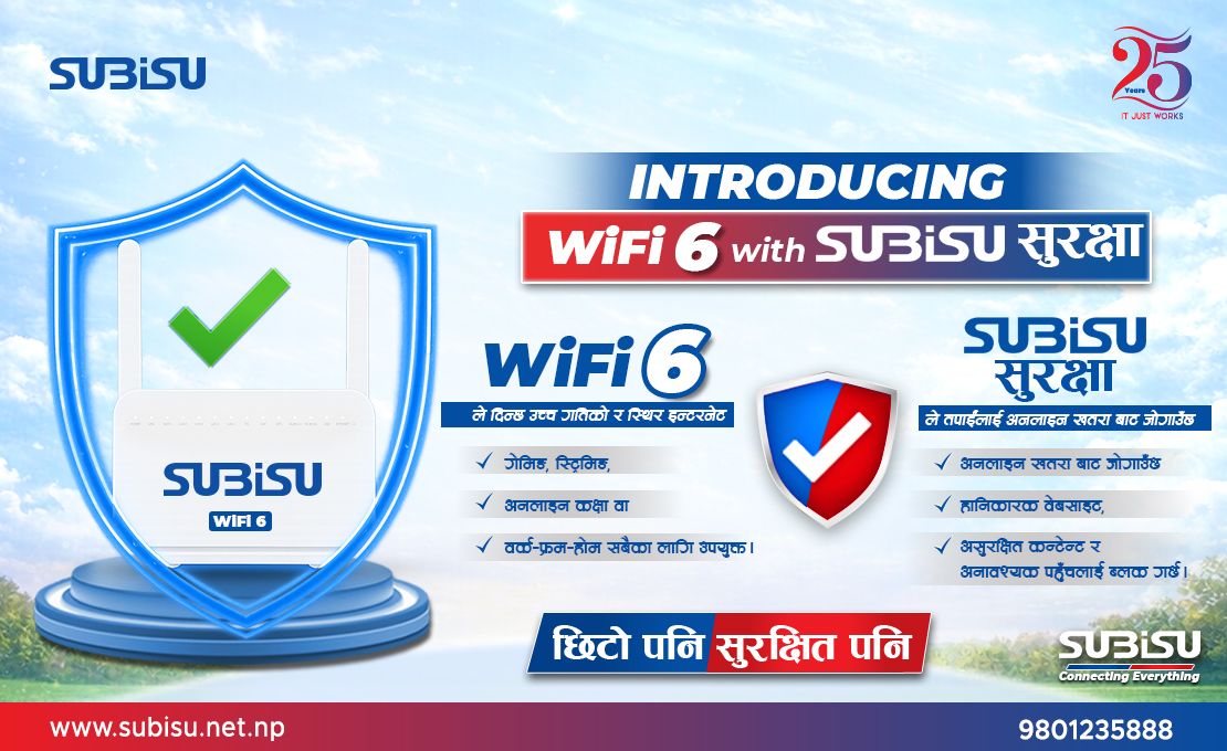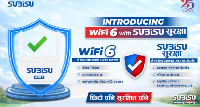 नेपालमा Wi-Fi 6 प्रविधि उपलब्ध भए तापनि, सुरक्षालाई विशेष प्राथमिकता दिँदै उच्चस्तरको सुरक्षित इन्टरनेट अनुभव प्रदान गर्ने SUBISU नेपालको पहिलो संस्था बनेको छ।