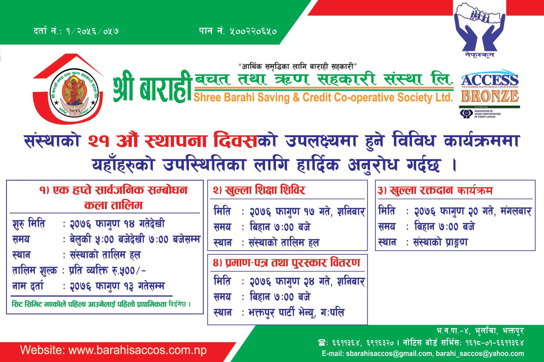 भक्तपुर, फागुन २४गते श्री बाराही बचत तथा ऋण सहकारी संस्था लि. को २१ औं स्थापना दिवसको उपलक्ष्यमा आयोजित प्रशंसा पत्र बितरण समारोह सम्पन्न भयो ।…