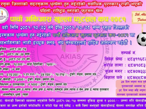 सर्वाधिक पुरस्कार सहित पाचौँ अकिआस खुल्ला फुटसल कप २०८१ सञ्चालन हुँदै रसुवाको सदरमुकाम स्थित धुन्चेमा आगामी माघको पहिलो साताबाट जिल्लाकै सर्वाधिक पुरस्कार राशिको पाँचौँ अकिआस…