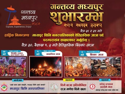 विस्का जात्रासँगै गन्तव्य मध्यपुरको तयारीमा मध्यपुर थिमी नपाभक्तपुर। चैत्र २३ गतेमध्यपुर थिमी नगरपालिकाले आसन्न बिस्का जात्रासँगै गन्तव्य मध्यपुरका कार्यक्रमहरु सार्वजनिक गरेको छ । मध्यपुर थिमीको…